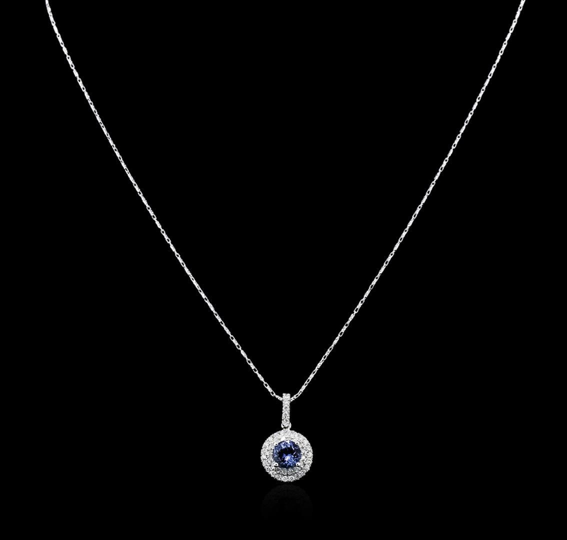 One electronically tested 14KT white gold ladies cast tanzanite and diamond pendant & chain 18.0" long, fancy link with a lobster claw clasp with a bright polish finish. Identified with markings of "14K". Condition is new. Containing: One prong set round modified brilliant cut natural tanzanite, measuring 7.00 - 7.00 x 4.55 mm, approximate weight of 1.49ct., clarity is eye clean, type I, light, slightly grayish, violet color, (GIA V 3/2), cut is good. Forty-Four prong set round brilliant cut diamonds, measuring 0.08 - 0.08 x 0.05mm (depth est.) approximate total weight of 44 Stones = 0.19ct. Clarity: I-1. Color: H - I, Cut is Good. Colored gemstones are presumed to have been subjected to commonly used enhancement processes. All diamonds and colored gemstones are graded in the mounting, unless otherwise stated. Total Weight of Colored Stones 1.49ct. Total Weight of Diamonds 0.19ct. Total Weight of Pendant & Chain 6.40 grams. GGL Appraised at $3,075.00.
