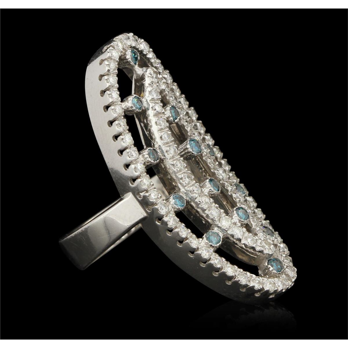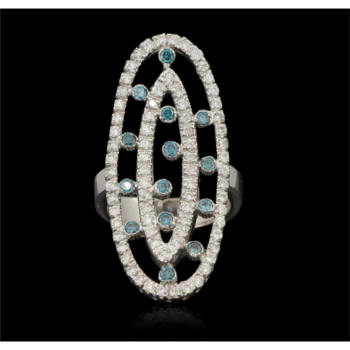 One electronically tested 14KT white gold ladies cast diamond ring with a bright polish finish. Condition is good. The ring features two diamond orbits interspersed with randomly placed diamonds, completed by a four and one-half millimeter wide band. Identified with markings of "K14". Containing: Fourteen bezel set round brilliant cut diamonds, measuring 1.90 - 1.80 x 1.11min (depth est.) approximate total weight of 14 Stones = 0.39ct. Indications of laboratory irradiated enhanced color. Graded in the setting. Clarity SI-1 to I-1. Color Fancy Very Slightly Greenish Blue Seventy-four prong set round brilliant cut diamonds, measuring 1.60 - 1.50 x 0.93mm (depth est.) approximate total weight of 74 Stones = 1.10ct. Graded in the setting. Clarity I-1 to I-2. Color G - I. Total Weight of Diamonds 1.49ct. Total Weight of Ring 10.90gm. AIG Appraised at $5,700.00.