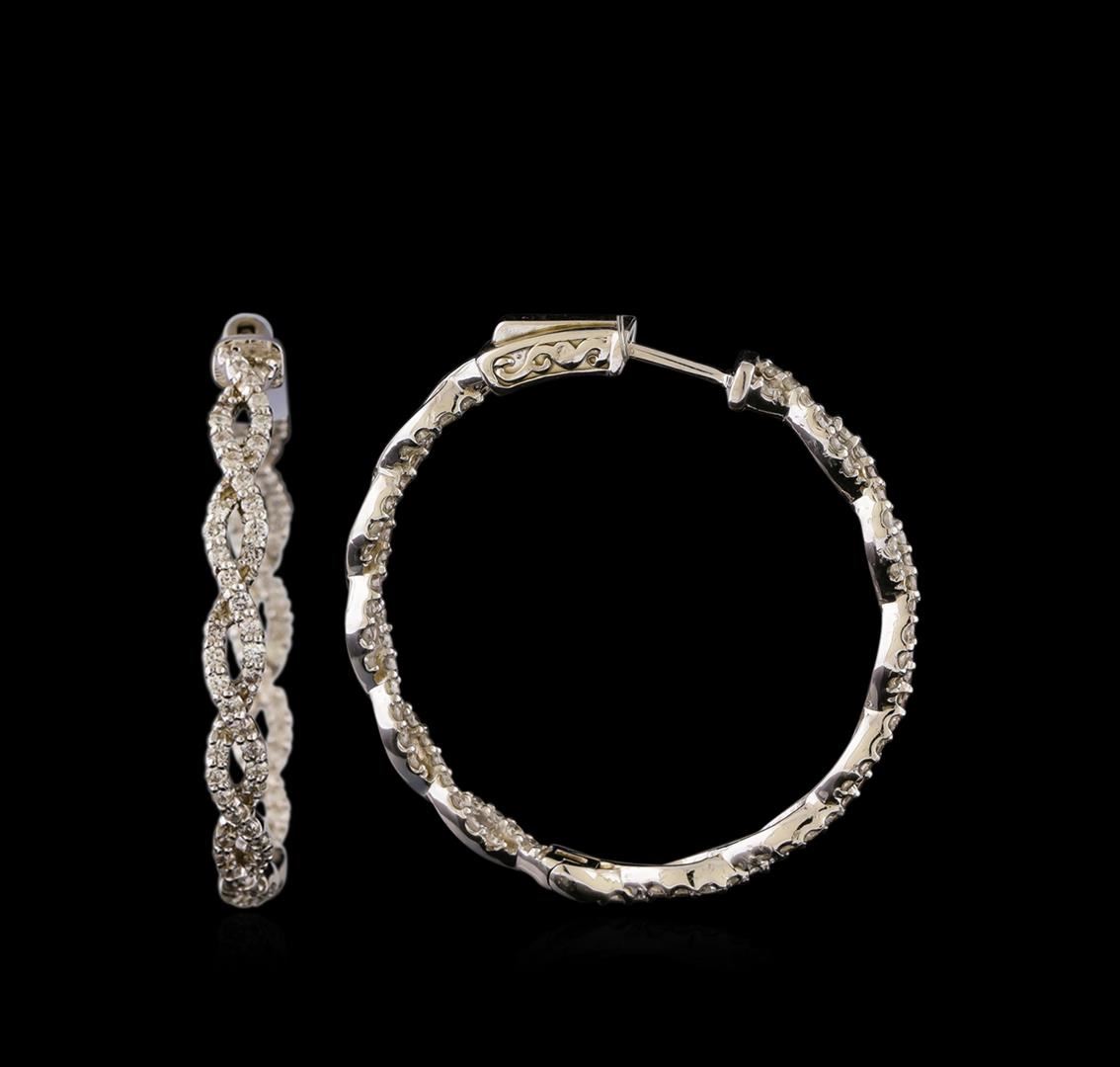 One pair electronically tested 14KT white gold ladies combination cast & assembled diamond hoop earrings with hinged clip backs with a bright polish finish. Identified with markings of "K14". Condition is new. Containing: One Hundred Eighty-Eight prong set round brilliant cut diamonds, measuring 1.30 - 1.30 x 0.78mm (depth est.) approximate total weight of 188 Stones = 1.50ct. Clarity: I-1. Color: H - I, Cut is Good. All diamonds are graded in the mounting, unless otherwise stated. Total Weight of Diamonds 1.50ct. Total Weight of Earrings 8.60 grams. GGL Appraised at $5,765.00.