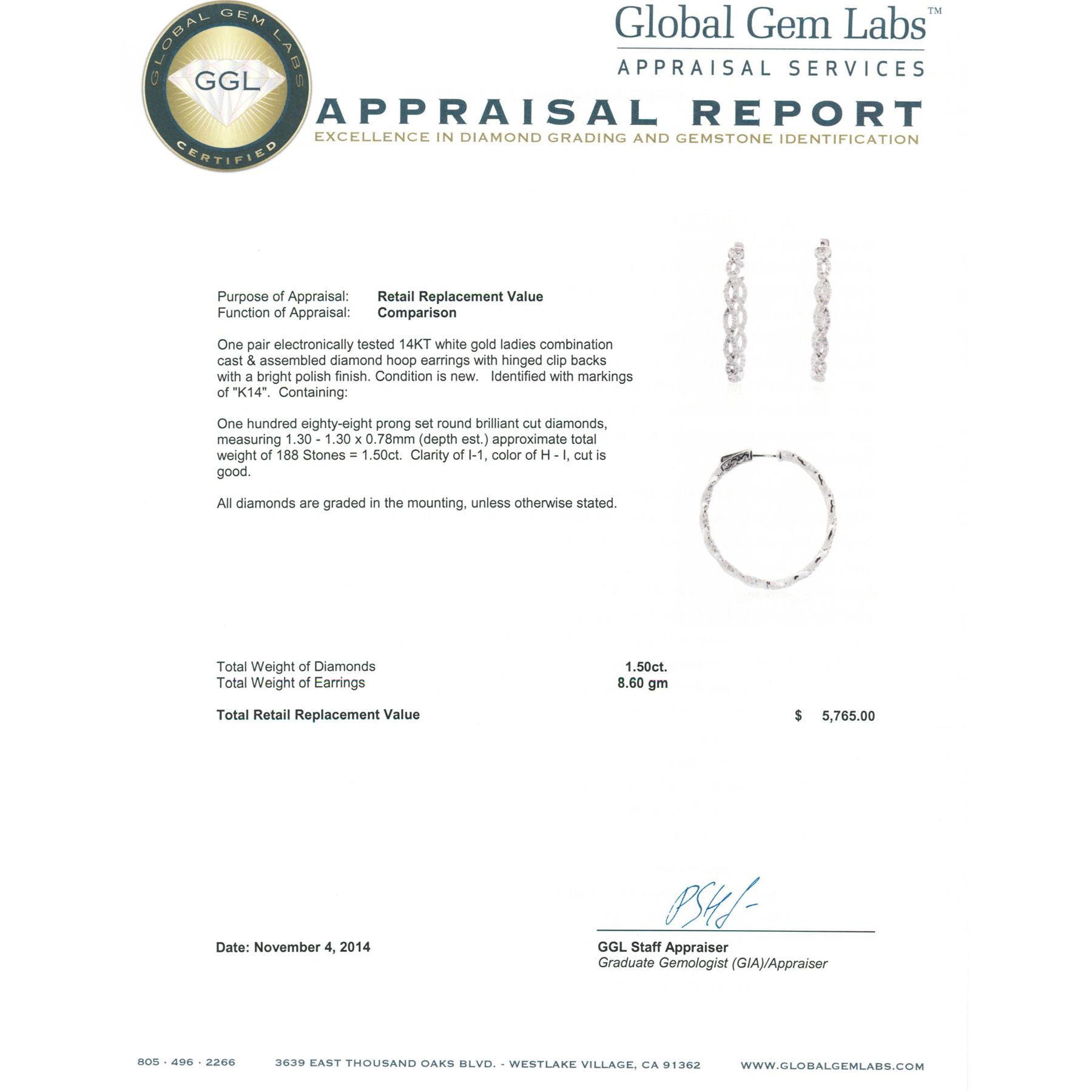 One pair electronically tested 14KT white gold ladies combination cast & assembled diamond hoop earrings with hinged clip backs with a bright polish finish. Identified with markings of "K14". Condition is new. Containing: One Hundred Eighty-Eight prong set round brilliant cut diamonds, measuring 1.30 - 1.30 x 0.78mm (depth est.) approximate total weight of 188 Stones = 1.50ct. Clarity: I-1. Color: H - I, Cut is Good. All diamonds are graded in the mounting, unless otherwise stated. Total Weight of Diamonds 1.50ct. Total Weight of Earrings 8.60 grams. GGL Appraised at $5,765.00.