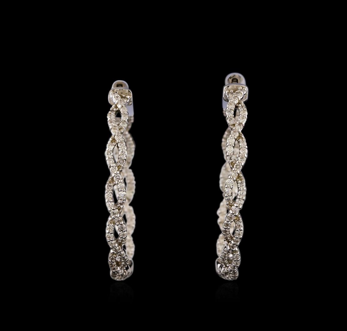 One pair electronically tested 14KT white gold ladies combination cast & assembled diamond hoop earrings with hinged clip backs with a bright polish finish. Identified with markings of "K14". Condition is new. Containing: One Hundred Eighty-Eight prong set round brilliant cut diamonds, measuring 1.30 - 1.30 x 0.78mm (depth est.) approximate total weight of 188 Stones = 1.50ct. Clarity: I-1. Color: H - I, Cut is Good. All diamonds are graded in the mounting, unless otherwise stated. Total Weight of Diamonds 1.50ct. Total Weight of Earrings 8.60 grams. GGL Appraised at $5,765.00.