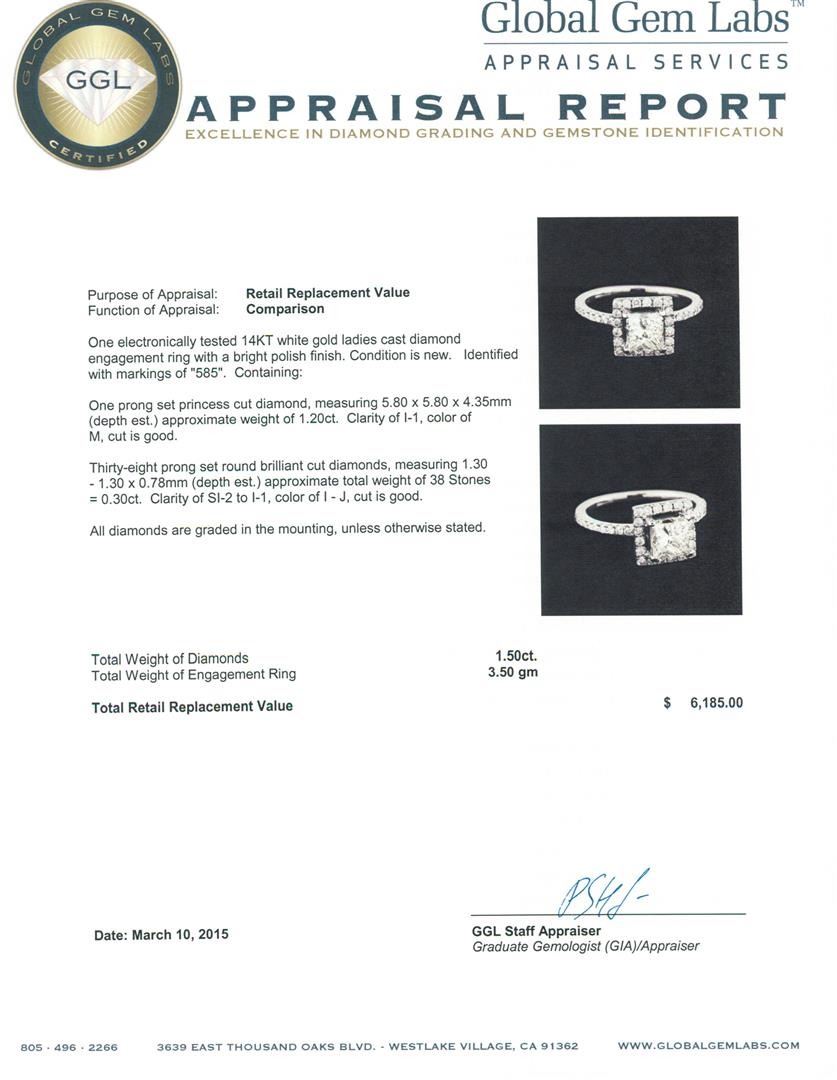 One electronically tested 14KT white gold ladies cast diamond engagement ring with a bright polish finish. Identified with markings of "585". Condition is new. Containing: One prong set princess cut diamond, measuring 5.80 x 5.80 x 4.35mm (depth est.) approximate weight of 1.20ct. Clarity: I-1. Color: M, Cut is Good. Thirty-Eight prong set round brilliant cut diamonds, measuring 1.30 - 1.30 x 0.78mm (depth est.) approximate total weight of 38 Stones = 0.30ct. Clarity: SI-2 to I-1. Color: I - J, Cut is Good. All diamonds are graded in the mounting, unless otherwise stated. Total Weight of Diamonds 1.50ct. Total Weight of Engagement Ring 3.50 grams. GGL Appraised at $6,185.00.