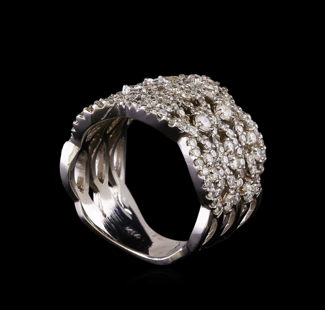 One electronically tested 14KT white gold ladies combination cast & assembled diamond ring with a split shank with a bright polish finish. Identified with markings of 14K. Condition is new. Containing: One Hundred Sixty-Four prong set round brilliant cut diamonds, measuring 2.00 - 1.20 x 0.96mm (depth est.) approximate total weight of 164 Stones = 1.50ct. Clarity: SI-1 to I-1. Color: I - J, Cut is Good. All diamonds are graded in the mounting, unless otherwise stated. Total Weight of Diamonds 1.50ct. Total Weight of Ring 10.30 grams. GGL Appraised at $6,150.00.