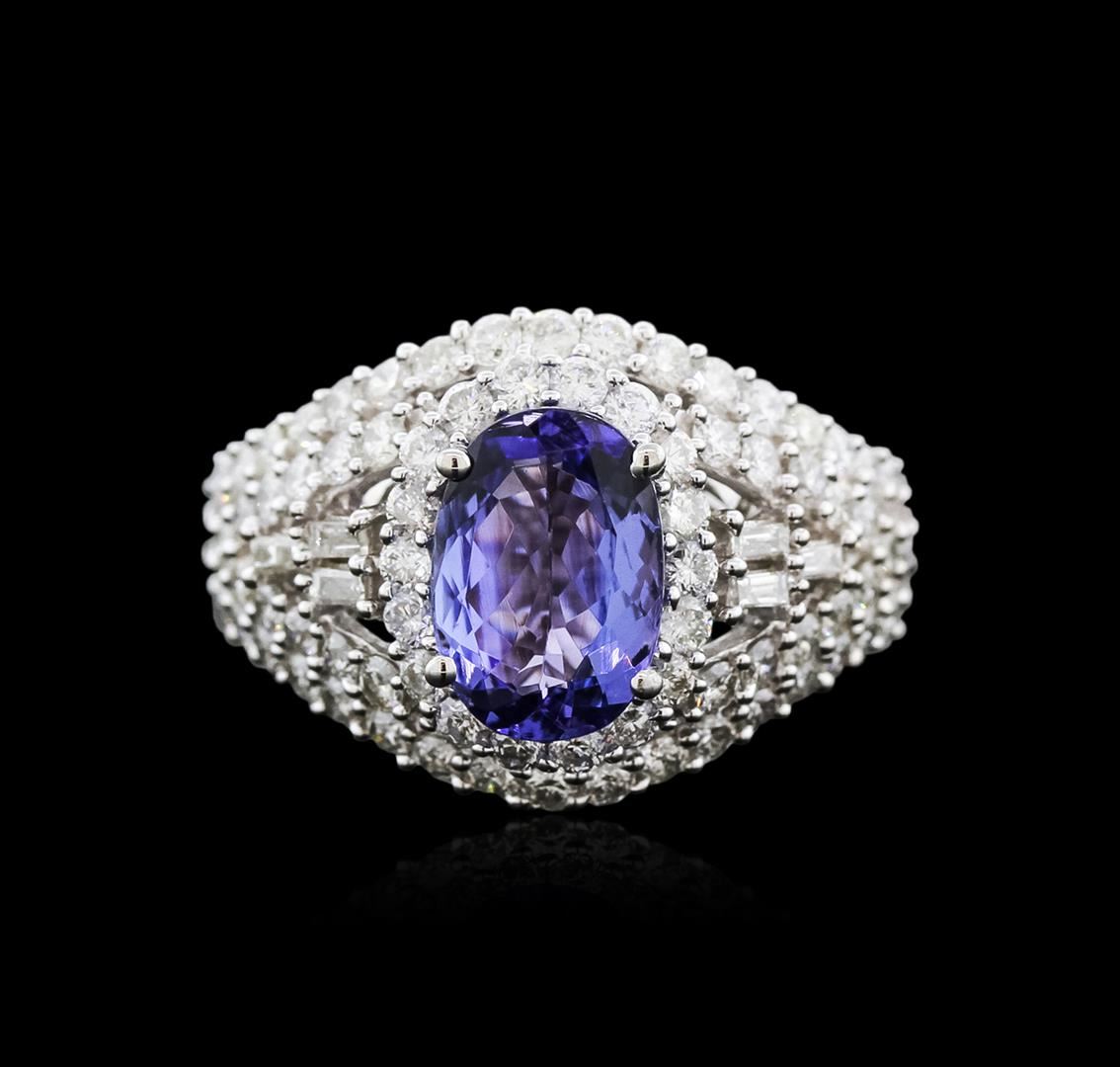 One electronically tested 14KT white gold ladies cast tanzanite and diamond ring with a tapered shank with a bright polish finish. Trademark is Orianne. Identified with markings of "14K". Condition is new. Containing: One prong set oval modified brilliant cut natural tanzanite, measuring 9.51 x 6.57 x 3.41mm, approximate weight of 1.50ct., clarity is eye clean, type I, light, very slightly grayish, bluish violet color, (GIA bV 3/3), cut is good. Seventy-Six prong set round brilliant cut diamonds, measuring 1.30 - 1.30 x 0.78mm (depth est.) approximate total weight of 76 Stones = 0.61ct. Clarity: SI-2 to I-2. Color: I - J. Six prong set baguette cut diamonds, measuring from 1.50 x 1.10 x 0.94mm (depth est.) to 1.80 x 1.10 x 0.94mm (depth est.) approximate total weight of 6 Stones = 0.09ct. Clarity: SI-1. Color: I - J. All diamonds and colored gemstones are graded in the mounting, unless otherwise stated. Colored gemstones are presumed to have been subjected to commonly used enhancement processes. Total Weight of Colored Stones 1.50ct. Total Weight of Diamonds 0.70ct. Total Weight of Ring 5.50 grams. GGL Appraised at $4,320.00.