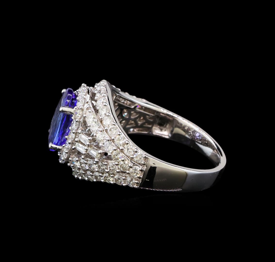 One electronically tested 14KT white gold ladies cast tanzanite and diamond ring with a tapered shank with a bright polish finish. Trademark is Orianne. Identified with markings of "14K". Condition is new. Containing: One prong set oval modified brilliant cut natural tanzanite, measuring 9.51 x 6.57 x 3.41mm, approximate weight of 1.50ct., clarity is eye clean, type I, light, very slightly grayish, bluish violet color, (GIA bV 3/3), cut is good. Seventy-Six prong set round brilliant cut diamonds, measuring 1.30 - 1.30 x 0.78mm (depth est.) approximate total weight of 76 Stones = 0.61ct. Clarity: SI-2 to I-2. Color: I - J. Six prong set baguette cut diamonds, measuring from 1.50 x 1.10 x 0.94mm (depth est.) to 1.80 x 1.10 x 0.94mm (depth est.) approximate total weight of 6 Stones = 0.09ct. Clarity: SI-1. Color: I - J. All diamonds and colored gemstones are graded in the mounting, unless otherwise stated. Colored gemstones are presumed to have been subjected to commonly used enhancement processes. Total Weight of Colored Stones 1.50ct. Total Weight of Diamonds 0.70ct. Total Weight of Ring 5.50 grams. GGL Appraised at $4,320.00.
