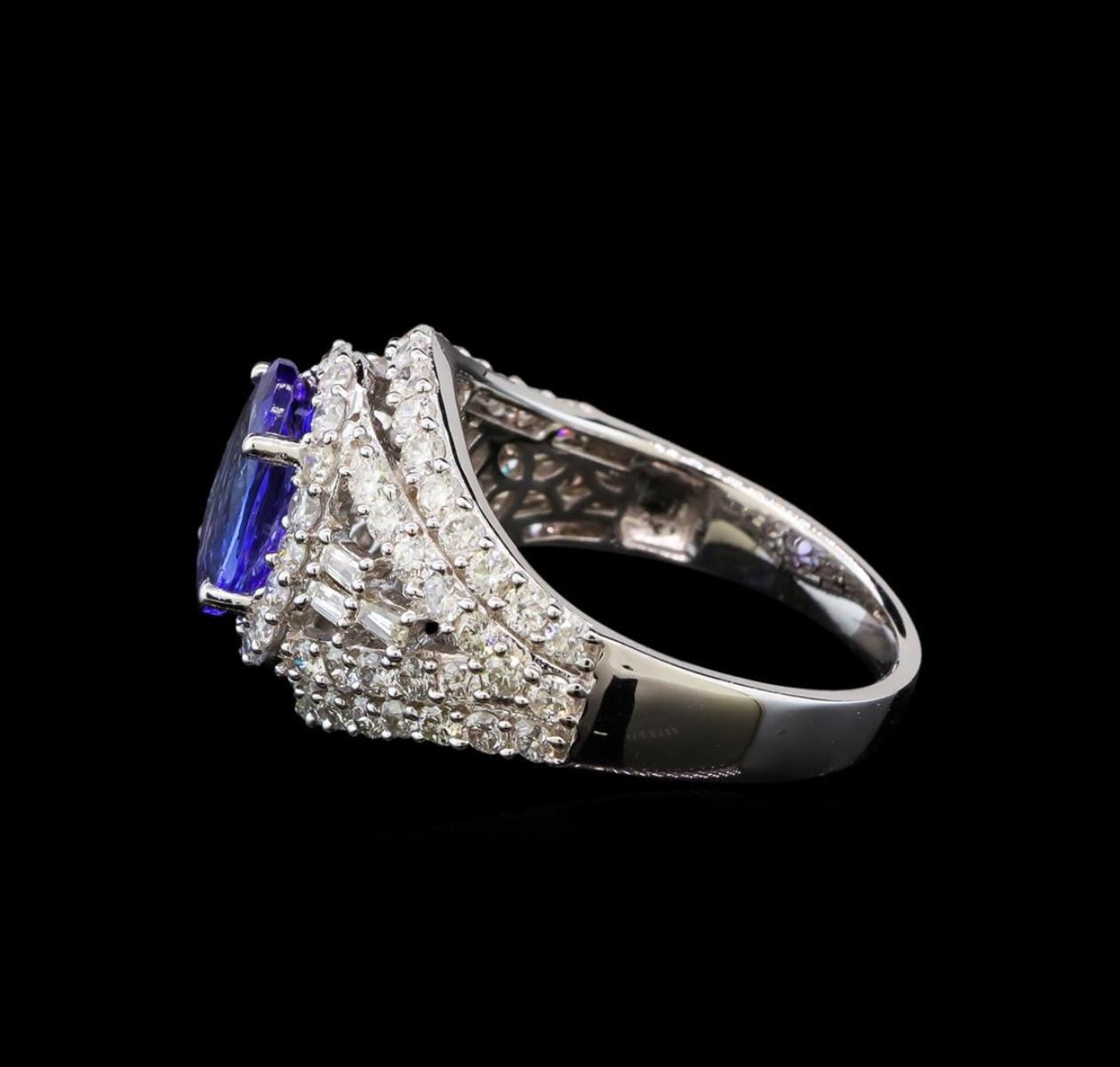 One electronically tested 14KT white gold ladies cast tanzanite and diamond ring with a tapered shank with a bright polish finish. Trademark is Orianne. Identified with markings of "14K". Condition is new. Containing: One prong set oval modified brilliant cut natural tanzanite, measuring 9.51 x 6.57 x 3.41mm, approximate weight of 1.50 ct., clarity is eye clean, type I, light, very slightly grayish, bluish violet color, (GIA bV 3/3), cut is good. Seventy-Six prong set round brilliant cut diamonds, measuring 1.30 - 1.30 x 0.78mm (depth est.) approximate total weight of 76 Stones = 0.61ct. Clarity: SI-2 to I-2. Color: I - J. Six prong set baguette cut diamonds, measuring from 1.50 x 1.10 x 0.94mm (depth est.) to 1.80 x 1.10 x 0.94mm (depth est.) approximate total weight of 6 Stones = 0.09ct. Clarity: SI-1. Color: I - J. All diamonds and colored gemstones are graded in the mounting, unless otherwise stated. Colored gemstones are presumed to have been subjected to commonly used enhancement processes. Total Weight of Colored Stones 1.50 ct. Total Weight of Diamonds 0.70 ct. Total Weight of Ring 5.50 grams. GGL Appraised.