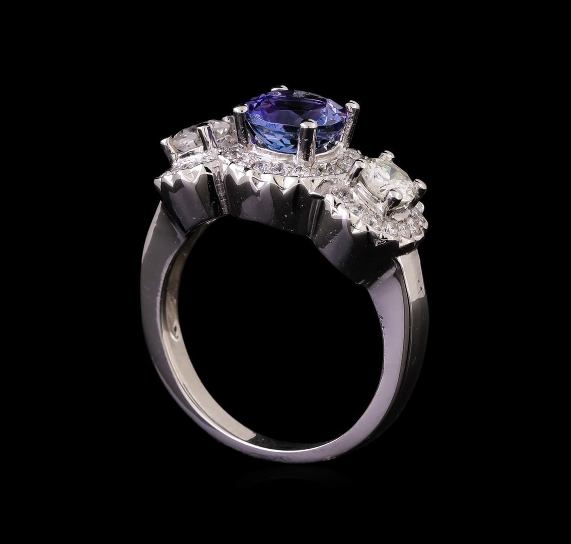 One electronically tested 14KT white gold ladies cast tanzanite and diamond ring with a bright polish finish. Identified with markings of "K14". Condition is new. Containing: One prong set round modified brilliant cut natural tanzanite, measuring 7.04 - 6.89 x 4.53 mm, approximate weight of 1.50 ct., clarity is eye clean, type I, medium light, very slightly grayish, violet color, (GIA V 4/3), cut is good. Two prong set round brilliant cut diamonds, measuring 4.30 - 4.30 x 2.58mm (depth est.) approximate total weight of 2 Stones = 0.58ct. Clarity: I-1 to I-2. Color: I - J, Cut is Good. Thirty-Eight prong set round brilliant cut diamonds, measuring 1.30 - 1.30 x 0.78mm (depth est.) approximate total weight of 38 Stones = 0.30 ct. Clarity: SI-2 to I-1. Color: I - J, Cut is Good. Colored gemstones are presumed to have been subjected to commonly used enhancement processes. All diamonds and colored gemstones are graded in the mounting, unless otherwise stated. Total Weight of Colored Stones 1.50 ct. Total Weight of Diamonds 0.89ct. Total Weight of Ring 5.90 grams.