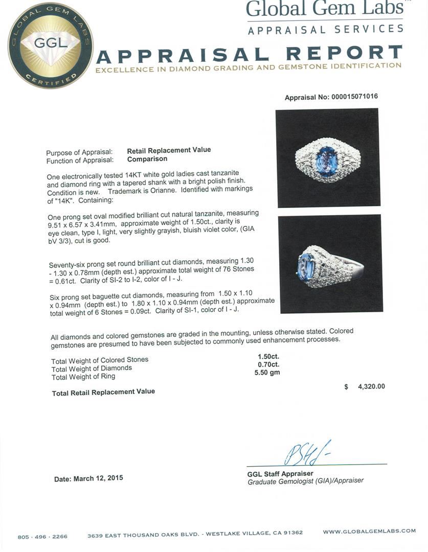 One electronically tested 14KT white gold ladies cast tanzanite and diamond ring with a tapered shank with a bright polish finish. Trademark is Orianne. Identified with markings of "14K". Condition is new. Containing: One prong set oval modified brilliant cut natural tanzanite, measuring 9.51 x 6.57 x 3.41mm, approximate weight of 1.50ct., clarity is eye clean, type I, light, very slightly grayish, bluish violet color, (GIA bV 3/3), cut is good. Seventy-Six prong set round brilliant cut diamonds, measuring 1.30 - 1.30 x 0.78mm (depth est.) approximate total weight of 76 Stones = 0.61ct. Clarity: SI-2 to I-2. Color: I - J. Six prong set baguette cut diamonds, measuring from 1.50 x 1.10 x 0.94mm (depth est.) to 1.80 x 1.10 x 0.94mm (depth est.) approximate total weight of 6 Stones = 0.09ct. Clarity: SI-1. Color: I - J. All diamonds and colored gemstones are graded in the mounting, unless otherwise stated. Colored gemstones are presumed to have been subjected to commonly used enhancement processes. Total Weight of Colored Stones 1.50ct. Total Weight of Diamonds 0.70ct. Total Weight of Ring 5.50 grams. GGL Appraised at $4,320.00.