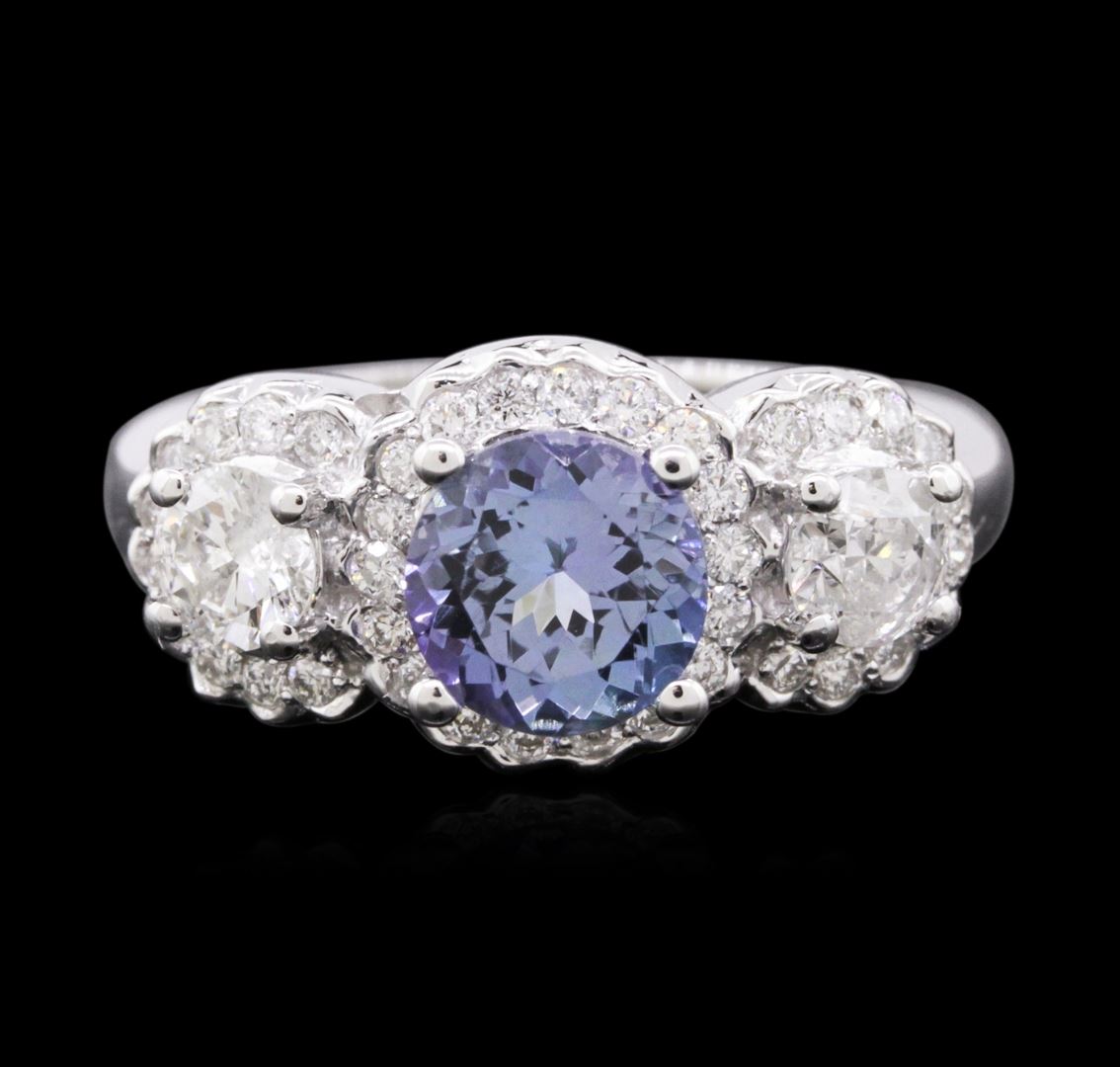 One electronically tested 14KT white gold ladies cast tanzanite and diamond ring with a bright polish finish. Identified with markings of "K14". Condition is new. Containing: One prong set round modified brilliant cut natural tanzanite, measuring 7.04 - 6.89 x 4.53 mm, approximate weight of 1.50ct., clarity is eye clean, type I, medium light, very slightly grayish, violet color, (GIA V 4/3), cut is good. Two prong set round brilliant cut diamonds, measuring 4.30 - 4.30 x 2.58mm (depth est.) approximate total weight of 2 Stones = 0.58ct. Clarity: I-1 to I-2. Color: I - J, Cut is Good. Thirty-Eight prong set round brilliant cut diamonds, measuring 1.30 - 1.30 x 0.78mm (depth est.) approximate total weight of 38 Stones = 0.30ct. Clarity: SI-2 to I-1. Color: I - J, Cut is Good. Colored gemstones are presumed to have been subjected to commonly used enhancement processes. All diamonds and colored gemstones are graded in the mounting, unless otherwise stated. Total Weight of Colored Stones 1.50ct. Total Weight of Diamonds 0.89ct. Total Weight of Ring 5.90 grams. GGL Appraised at $5,385.00.