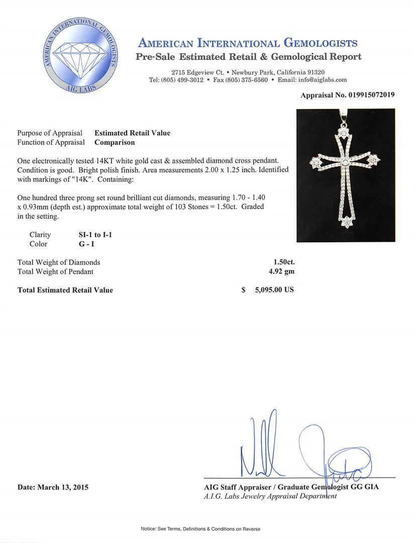 One electronically tested 14KT white gold cast & assembled diamond cross pendant. Bright polish finish. Area measurements 2.00 x 1.25 inch. Identified with markings of "14K". Condition is good. Containing: One Hundred Three prong set round brilliant cut diamonds, measuring 1.70 - 1.40 x 0.93mm (depth est.) approximate total weight of 103 Stones = 1.50ct. Graded in the setting. Clarity: SI-1 to I-1. Color: G - I. Total Weight of Diamonds 1.50ct. Total Weight of Pendant 4.92 grams. AIG Appraised at $5,095.00.