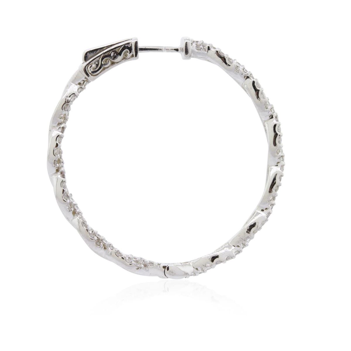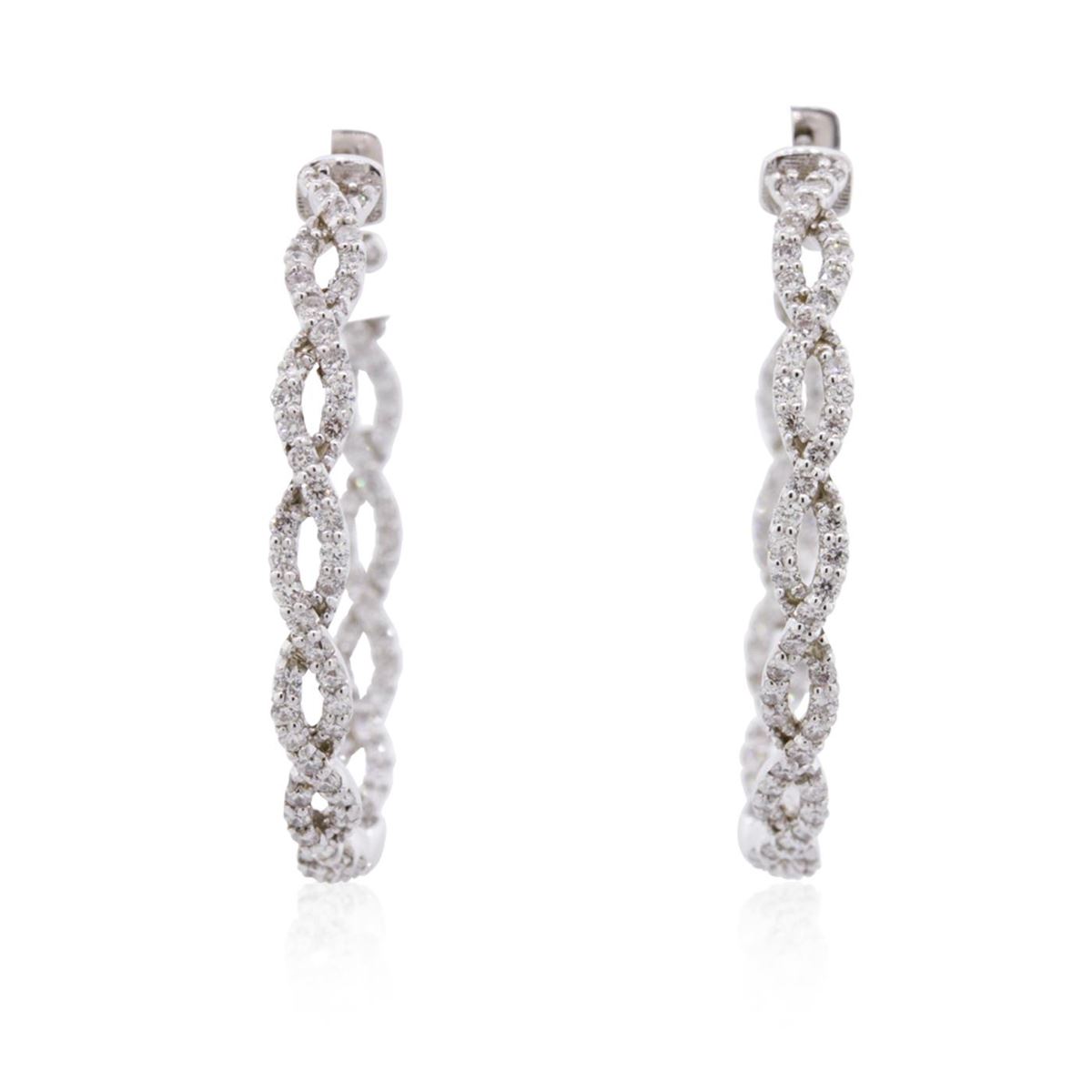 One pair electronically tested 14KT white gold ladies combination cast & assembled diamond hoop earrings with hinged clip backs with a bright polish finish. Identified with markings of "K14". Condition is new. Containing: One Hundred Eighty-Eight prong set round brilliant cut diamonds, measuring 1.30 - 1.30 x 0.78mm (depth est.) approximate total weight of 188 Stones = 1.50ct. Clarity: I-1. Color: H - I, Cut is Good. All diamonds are graded in the mounting, unless otherwise stated. Total Weight of Diamonds 1.50ct. Total Weight of Earrings 8.60 grams. GGL Appraised at $5,765.00.