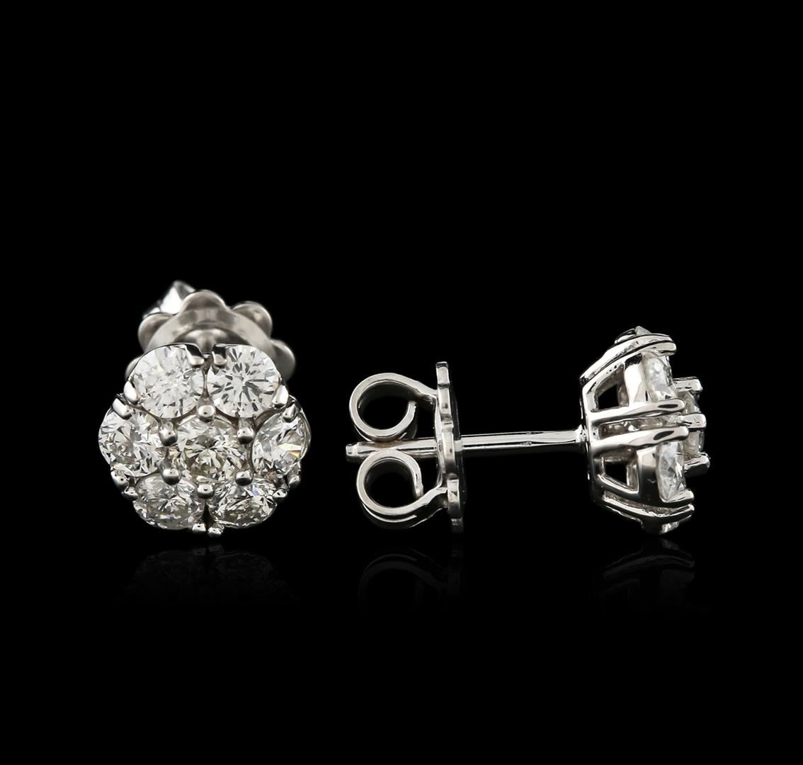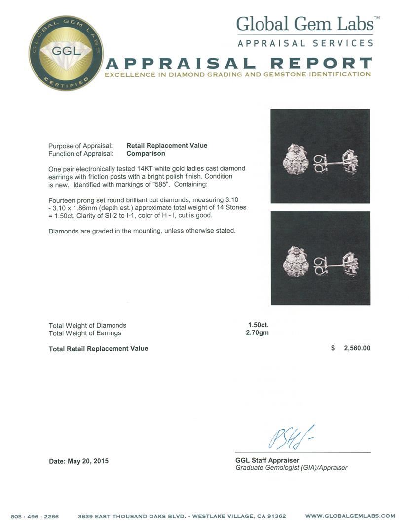 One pair electronically tested 14KT white gold ladies cast diamond earrings with friction posts with a bright polish finish. Identified with markings of "585". Condition is new. Containing: Fourteen prong set round brilliant cut diamonds, measuring 3.10 - 3.10 x 1.86mm (depth est.) approximate total weight of 14 Stones = 1.50ct. Clarity: SI-2 to I-1. Color: H - I, Cut is Good. Diamonds are graded in the mounting, unless otherwise stated. Total Weight of Diamonds 1.50ct. Total Weight of Earrings 2.70 grams. GGL Appraised at $2,560.00.