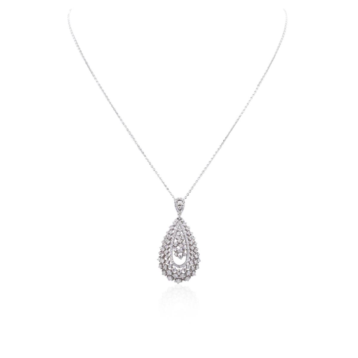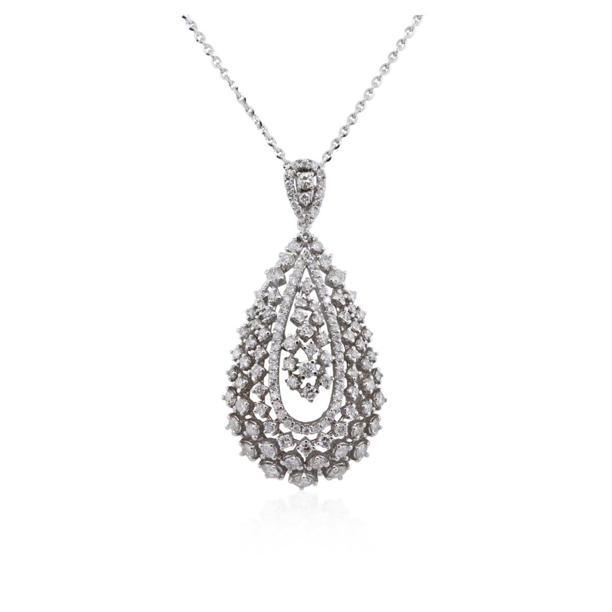 One electronically tested 14KT white gold ladies combination cast & assembled diamond pendant & chain 18.0" long, large cable link with a lobster claw clasp with a bright polish finish. Identified with markings of "K14". Condition is new. Containing: One Hundred Thirty-Three prong set round brilliant cut diamonds, measuring 2.10 - 1.10 x 0.96mm (depth est.) approximate total weight of 133 Stones = 1.50ct. Clarity: I-1 to I-2. Color: I - J, Cut is Good. All diamonds are graded in the mounting, unless otherwise stated. Total Weight of Diamonds 1.50ct. Total Weight of Pendant & Chain 9.20 grams. GGL Appraised at $5,350.00.