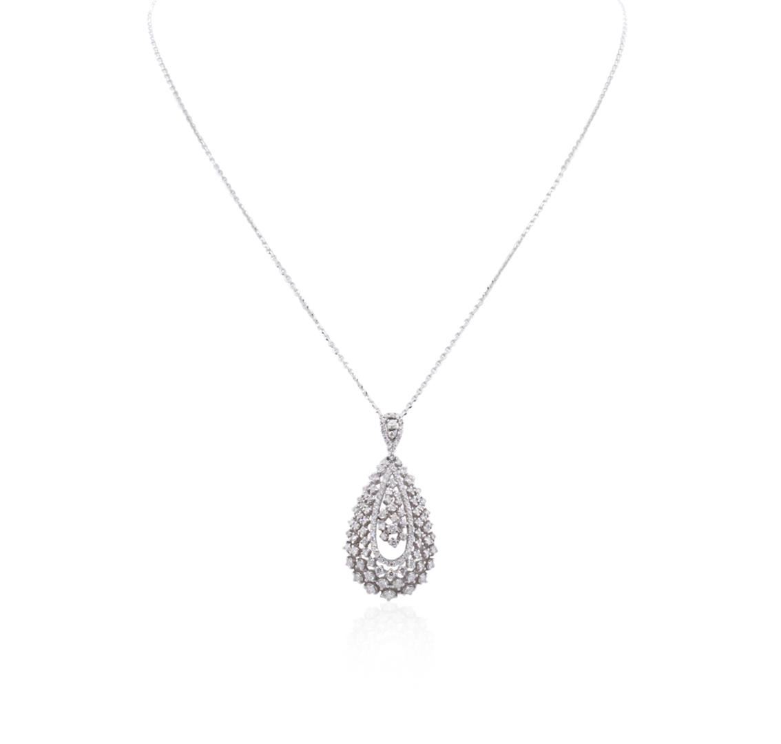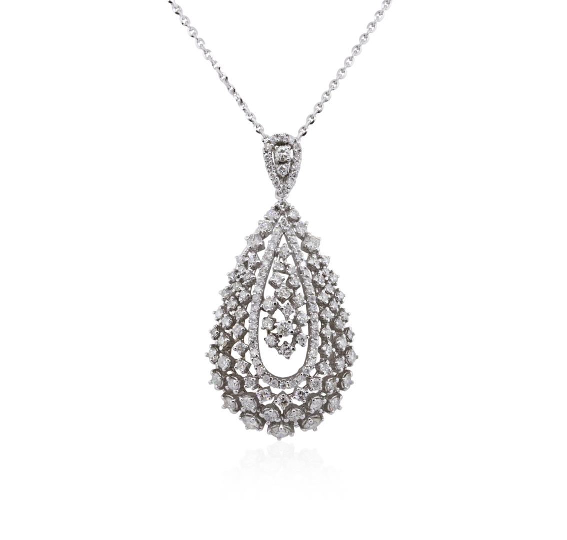 One electronically tested 14KT white gold ladies combination cast & assembled diamond pendant & chain 18.0" long, large cable link with a lobster claw clasp with a bright polish finish. Identified with markings of "K14". Condition is new. Containing: One Hundred Thirty-Three prong set round brilliant cut diamonds, measuring 2.10 - 1.10 x 0.96mm (depth est.) approximate total weight of 133 Stones = 1.50ct. Clarity: I-1 to I-2. Color: I - J, Cut is Good. All diamonds are graded in the mounting, unless otherwise stated. Total Weight of Diamonds 1.50ct. Total Weight of Pendant & Chain 9.20 grams. GGL Appraised at $5,350.00.