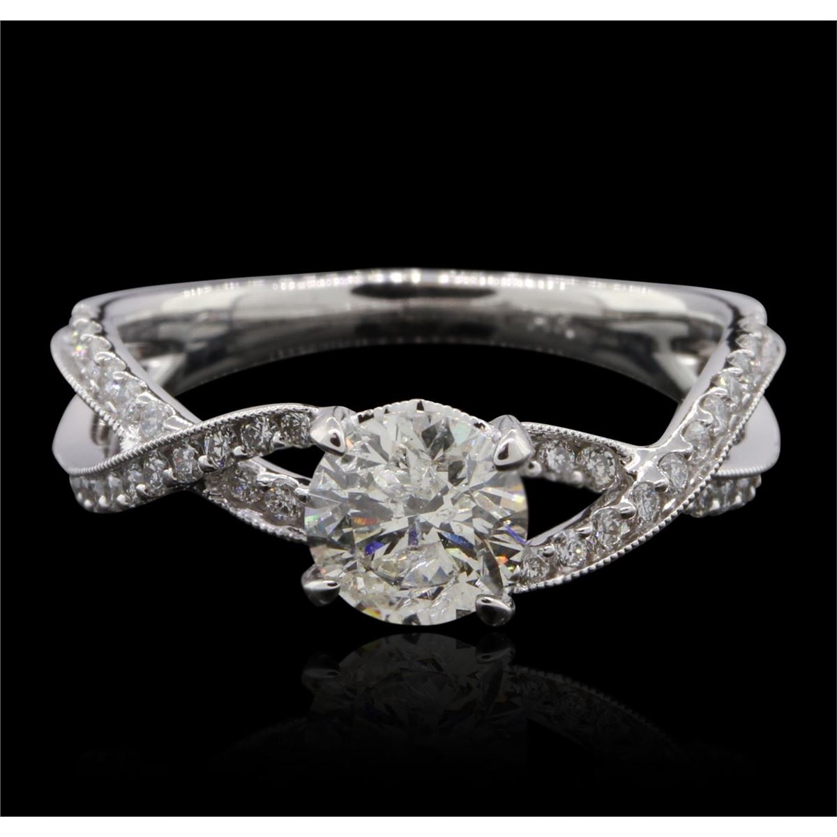 One electronically tested 14KT white gold Ladies combination cast & assembled engagement ring with a bright polish finish. Identified with markings of "14K". Condition is excellent. Containing: One prong set round brilliant cut diamond, measuring 6.50 - 6.40 x 4.00mm (depth est.) approximate weight of 1.00ct. Clarity of I-2, Color of J, Cut is Good. Forty-Four prong set round brilliant cut diamonds, measuring 1.40 - 1.30 x 0.81mm (depth est.) approximate total weight of 44 Stones = 0.50ct. Clarity of SI-1 to I-1, Color of F - G. Total Weight of Diamonds 1.50ct. Total Weight of Ring 3.50gm. GGL Appraised at $10,510.00.