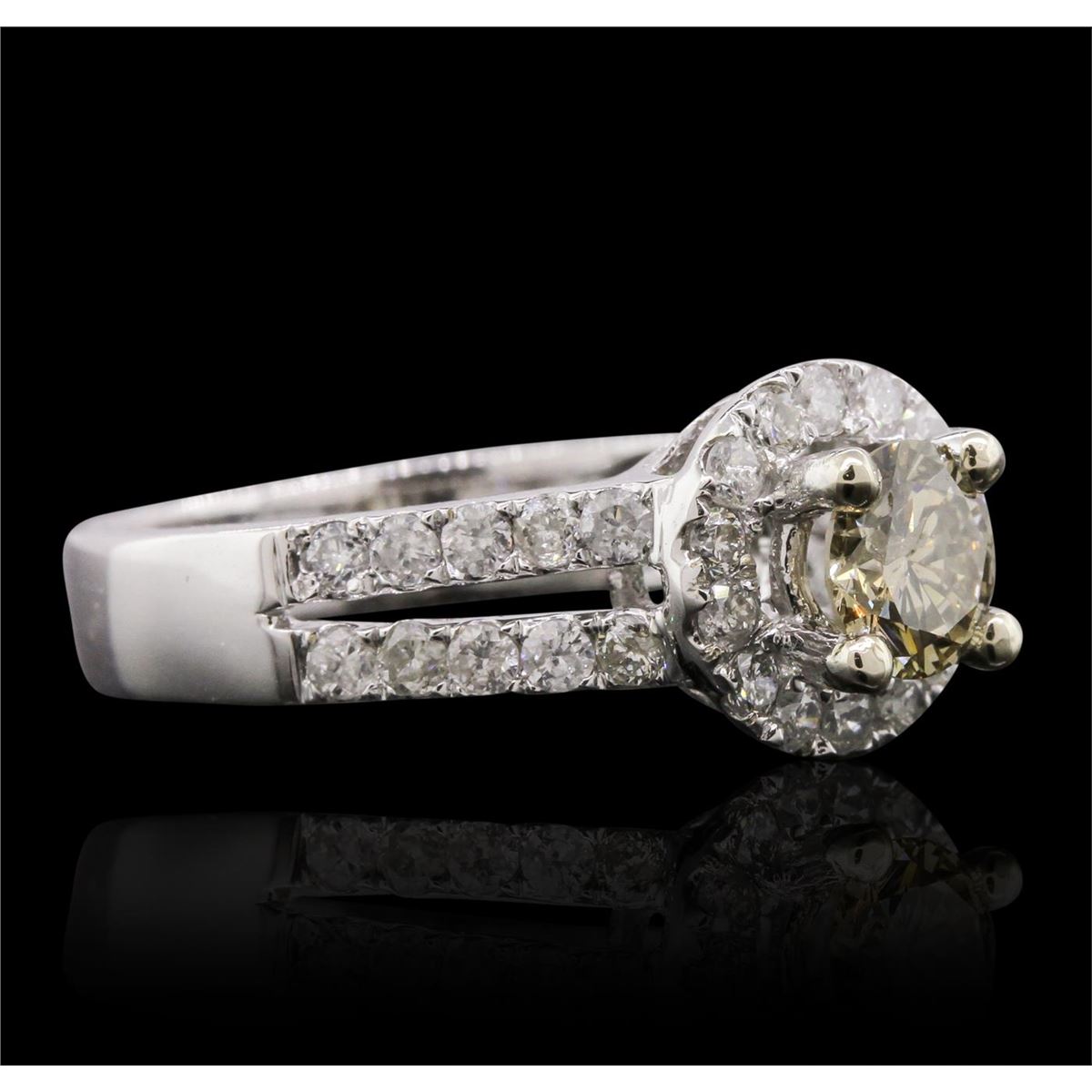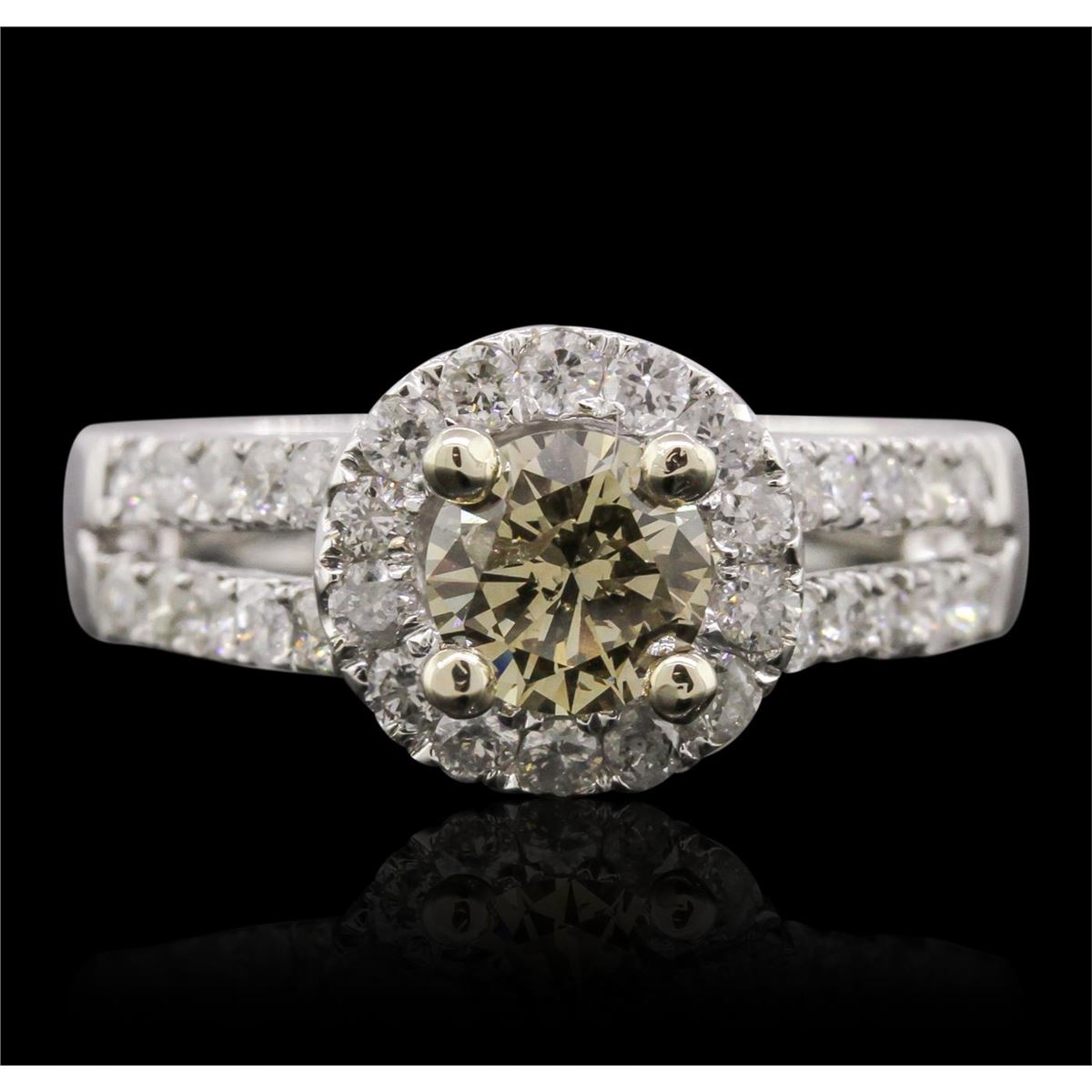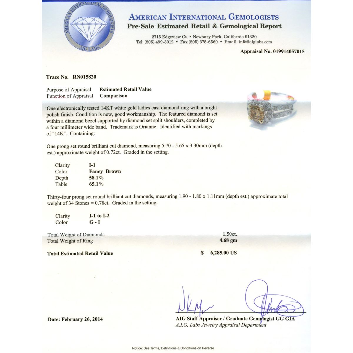 One electronically tested 14KT white gold ladies cast diamond ring with a bright polish finish. Condition is new, good workmanship. The featured diamond is set within a diamond bezel supported by diamond split shoulders, completed by a four millimeter wide band. Trademark is Orianne. Identified with markings of "14K". Containing: One prong set round brilliant cut diamond, measuring 5.70 - 5.65 x 3.30mm (depth est) approximate weight of 0.72ct. Graded in the setting. Clarity I-1 Color Fancy Brown Depth 58.1% Table 65.1%. Thirty-four prong set round brilliant cut diamonds, measuring 1.90 - 1.80 x 1.11mm (depth est) approximate total weight of 34 Stones = 0.78ct. Graded in the setting. Clarity I-1 to I-2. Color G-I. Total Weight of Diamonds 1.50ct. Total Weight of Ring 4.68 grams. AIG Appraised at $6,285.00.