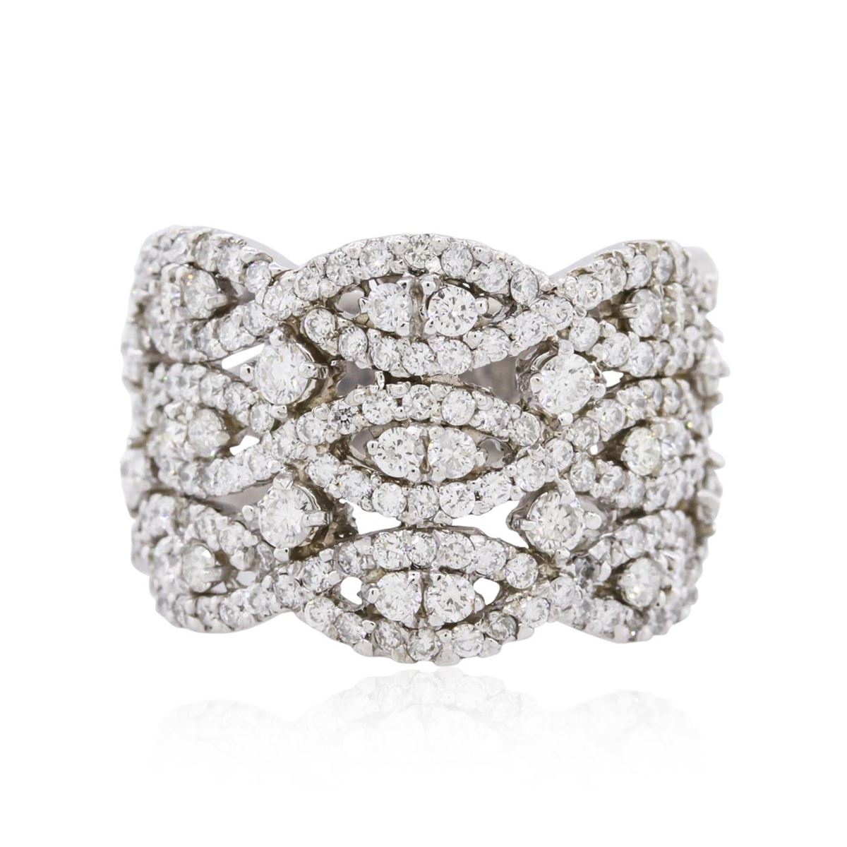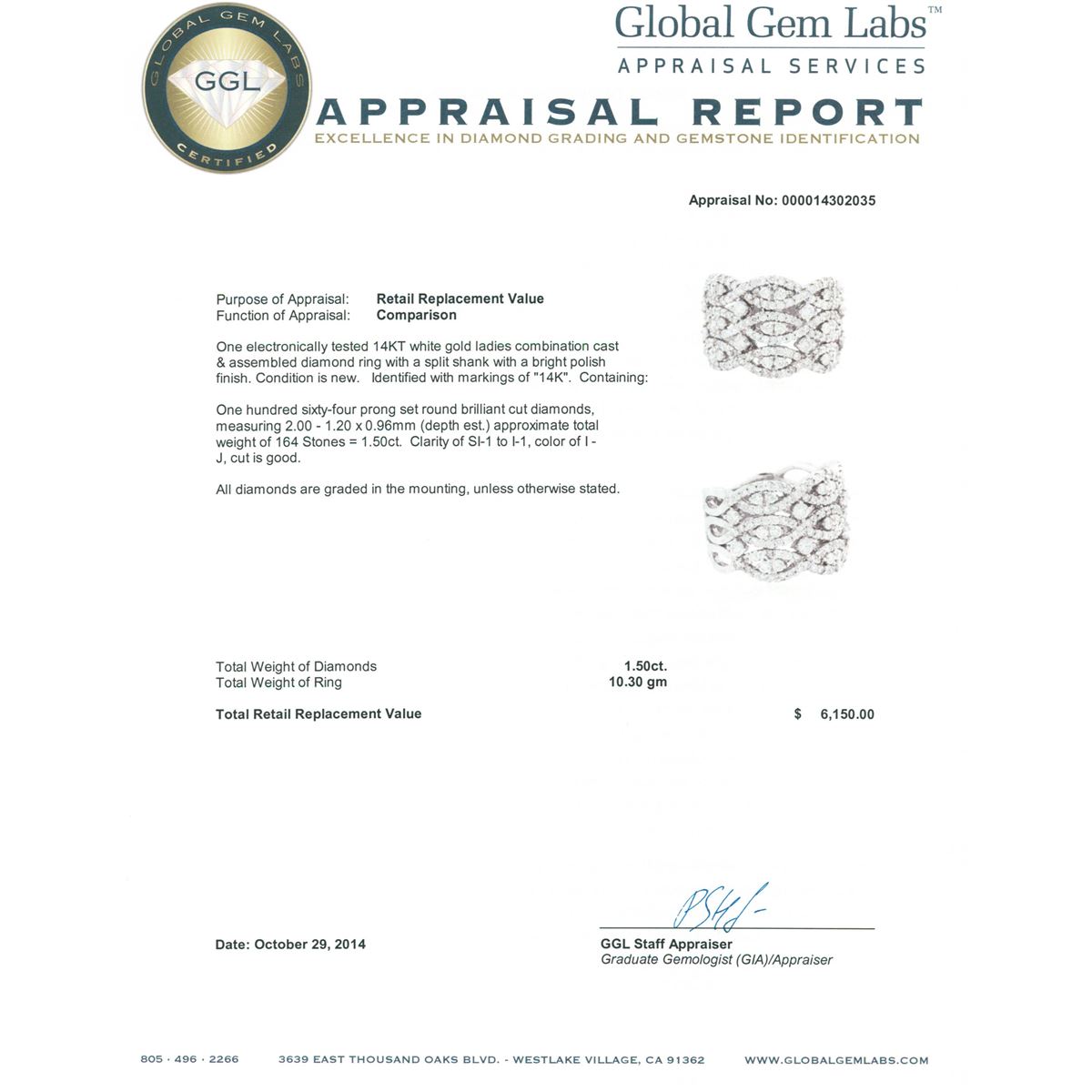One electronically tested 14KT white gold ladies combination cast & assembled diamond ring with a split shank with a bright polish finish. Identified with markings of 14K. Condition is new. Containing: One Hundred Sixty-Four prong set round brilliant cut diamonds, measuring 2.00 - 1.20 x 0.96mm (depth est.) approximate total weight of 164 Stones = 1.50ct. Clarity: SI-1 to I-1. Color: I - J, Cut is Good. All diamonds are graded in the mounting, unless otherwise stated. Total Weight of Diamonds 1.50ct. Total Weight of Ring 10.30 grams. GGL Appraised at $6,150.00.