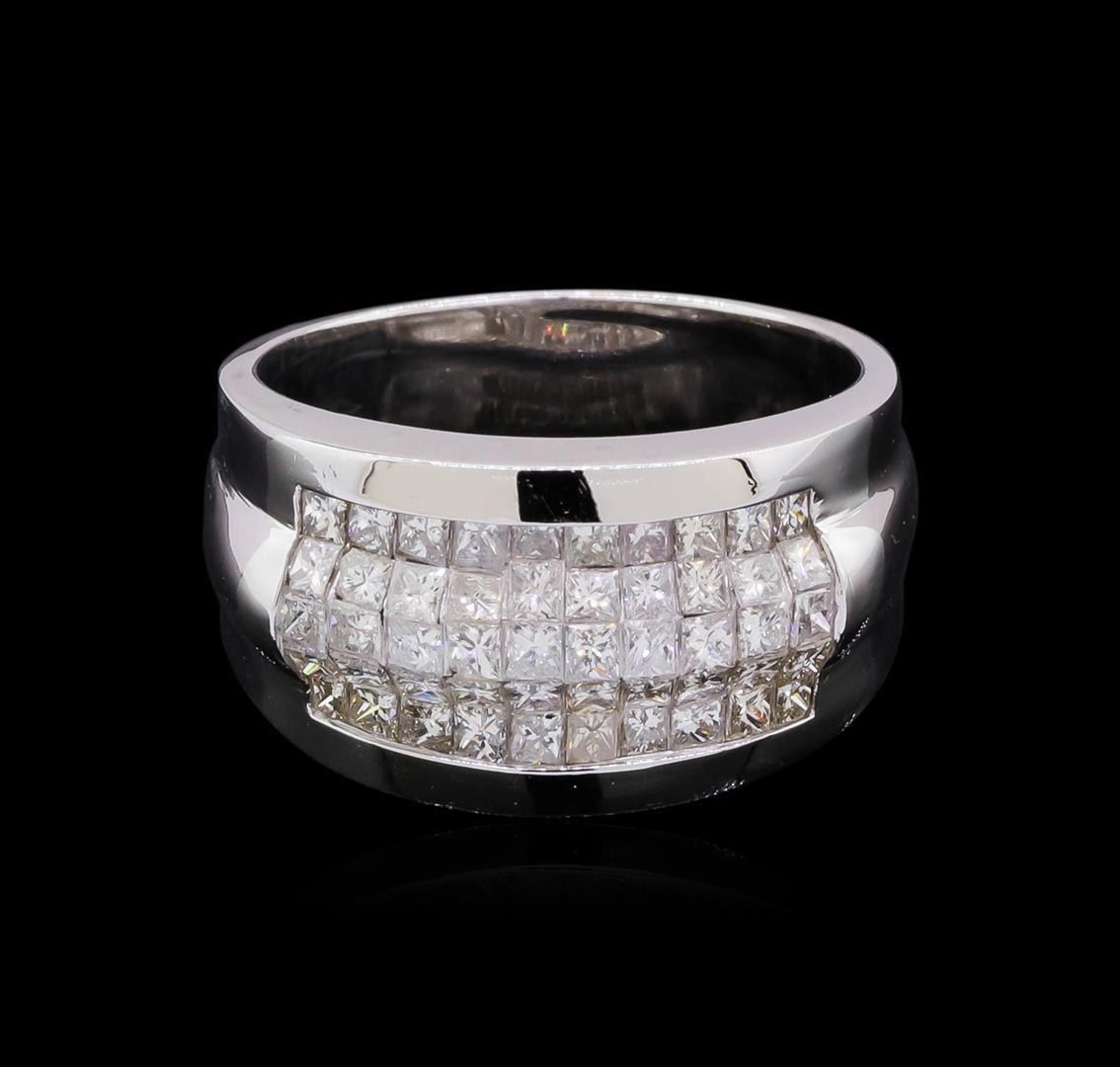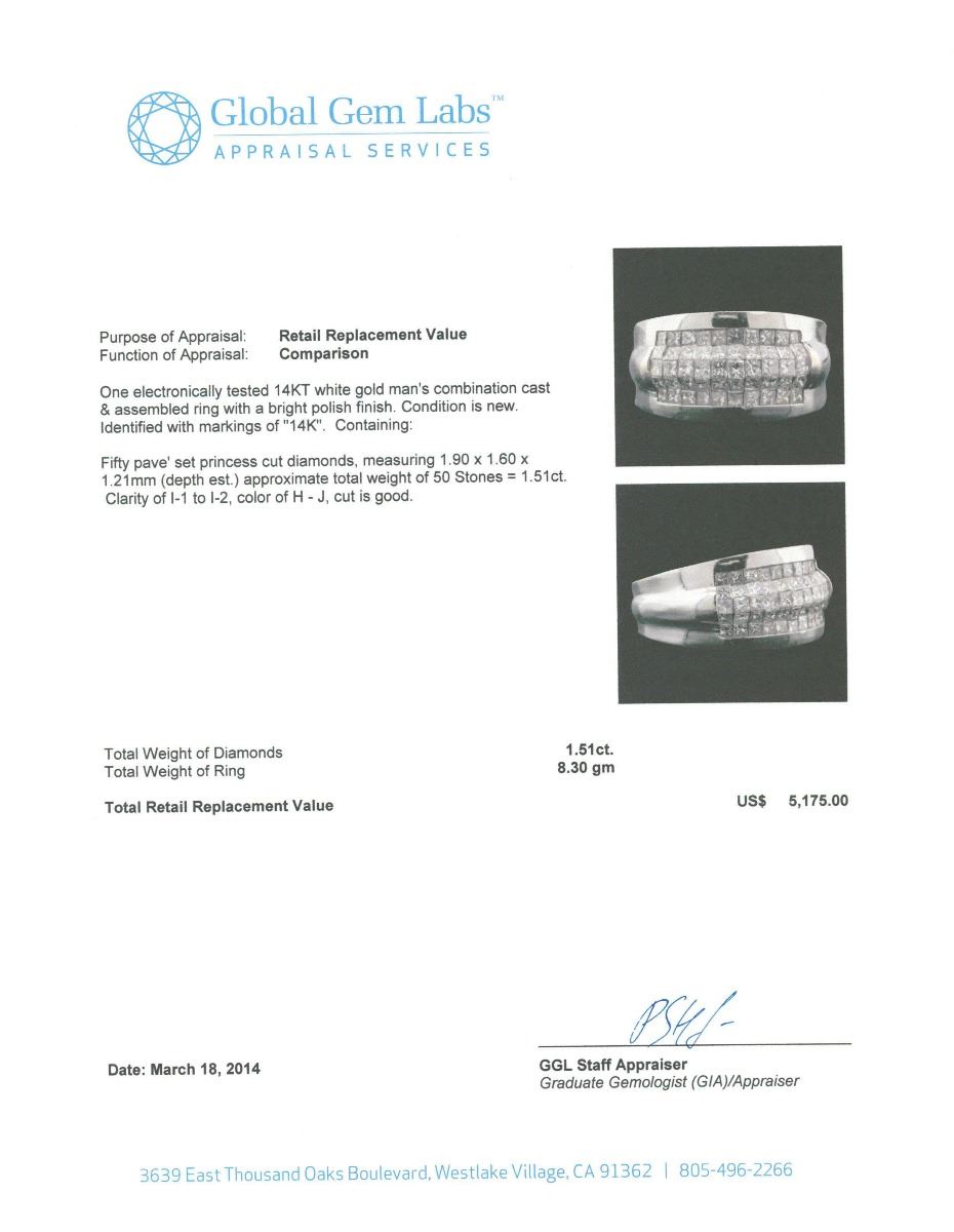 One electronically tested 14KT white gold man's combination cast & assembled ring with a bright polish finish. Condition is new. Identified with markings of "14K". Containing: Fifty pave' set princess cut diamonds, measuring 1.90 x 1.60 x 1.21mm (depth est.) approximate. Total Weight of 50 Stones = 1.51ct. Clarity: I-1 to I-2. Color: H - J, Cut is Good. Total Weight of Diamonds 1.51ct. Total Weight of Ring 8.30gm. GGL Appraised at $5,175.00.
