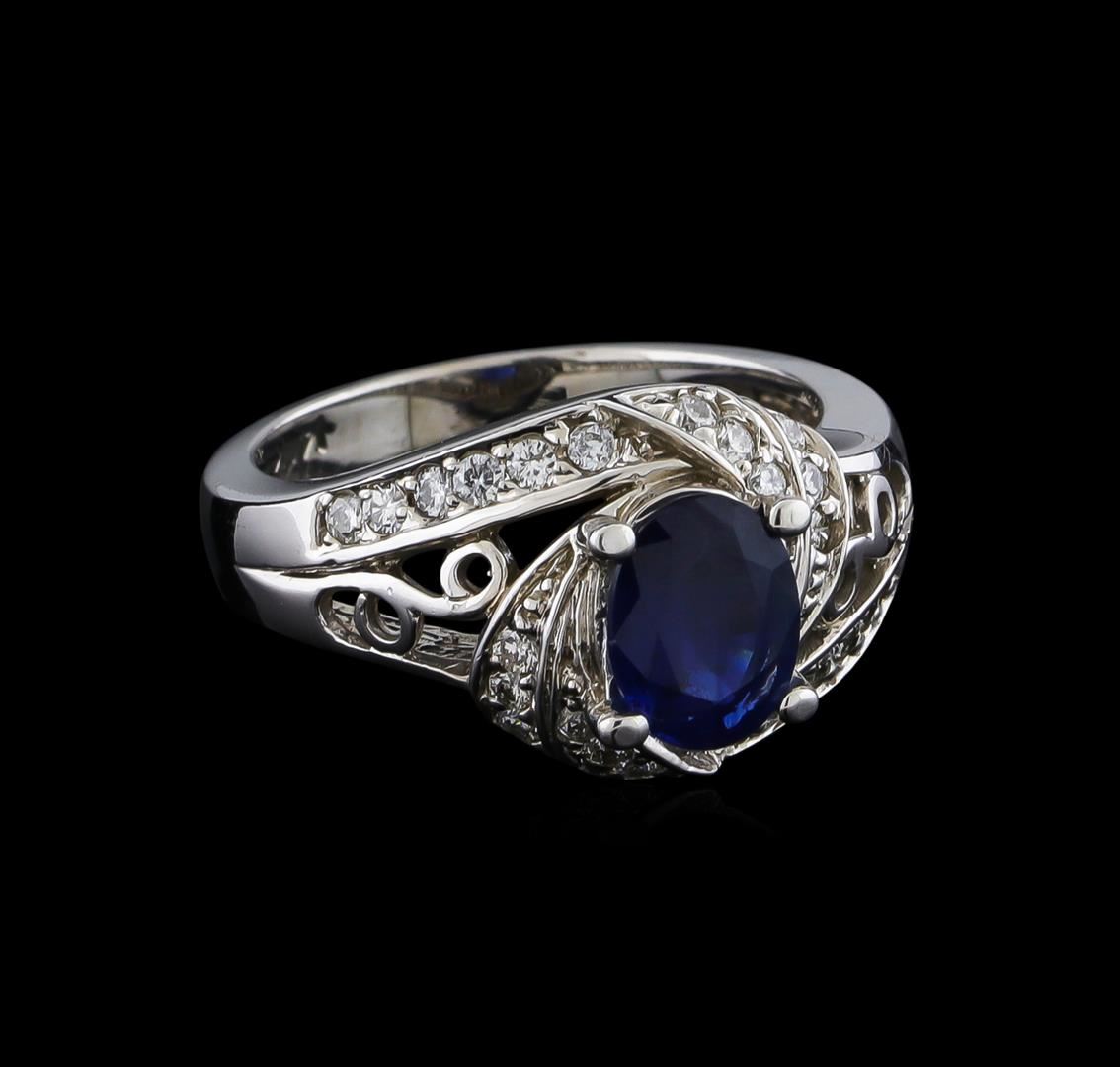 One electronically tested 14KT white gold ladies cast ring with a tapered shank with a bright polish finish. Identified with markings of "14K". Condition is new. Containing: One prong set oval modified brilliant cut natural blue sapphire, measuring 7.93 x 6.07 x 3.86mm, approximate weight of 1.51ct., clarity is heavily included, type II, medium dark, moderately strong, blue color, (GIA B 6/4), cut is good. Twenty-Four prong set round brilliant cut diamonds, measuring 1.50 - 1.50 x 0.90mm (depth est.) approximate total weight of 24 Stones = 0.30ct. Clarity: I-1 to I-2. Color: H - I, Cut is Good. Colored gemstones are presumed to have been subjected to commonly used enhancement processes, All diamonds and colored gemstones are graded in the mounting, unless otherwise stated. Total Weight of Colored Stones 1.51ct. Total Weight of Diamonds 0.30ct. Total Weight of Ring 6.00 grams. GGL Appraised at $3,290.00.