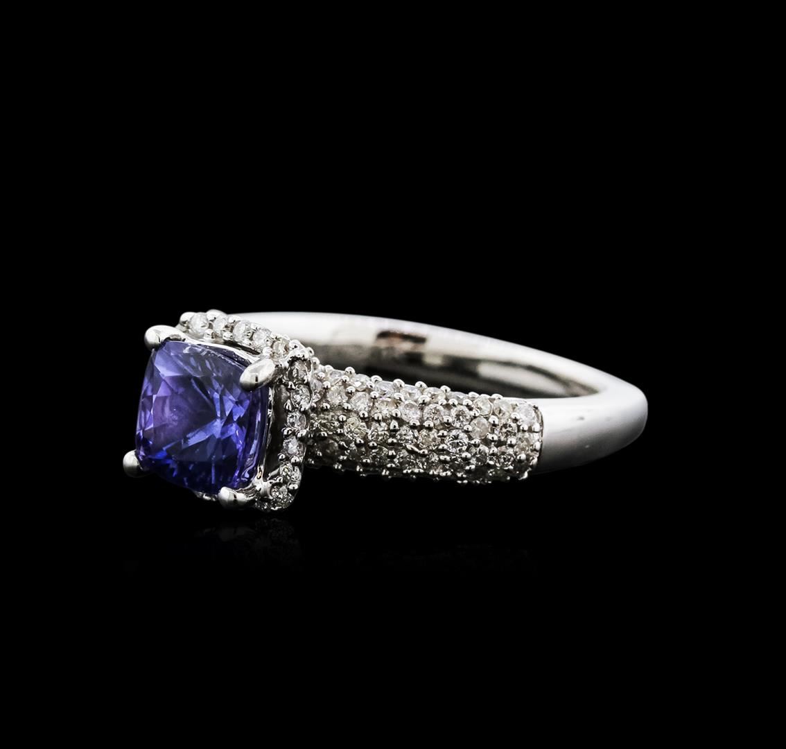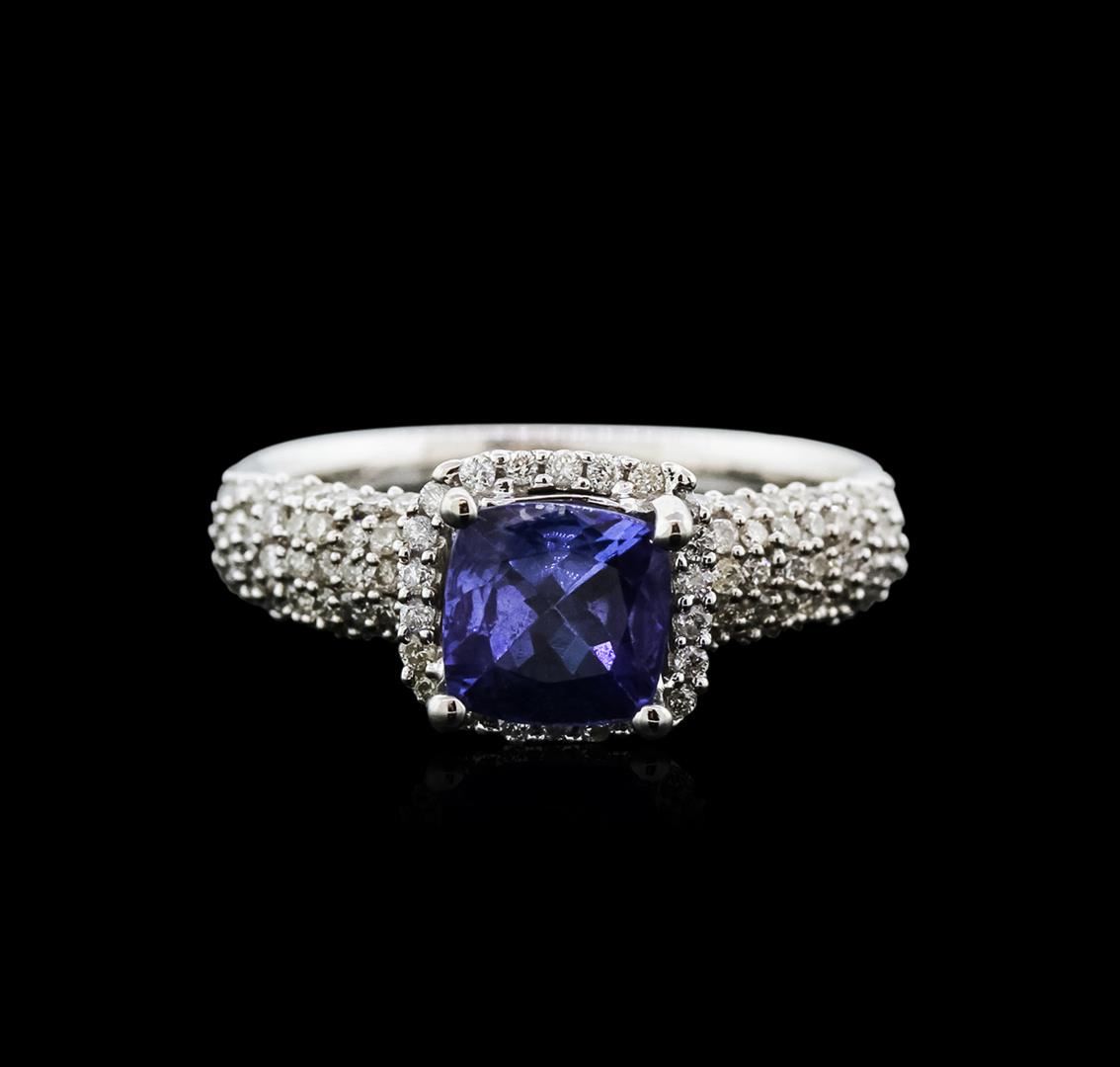 One electronically tested 14KT white gold ladies cast tanzanite and diamond ring with a flat shank with rounded edges with a bright polish finish. Trademark is Orianne. Identified with markings of "14K". Condition is new. Containing: One prong set square cushion modified brilliant cut natural tanzanite, measuring 6.50 x 6.47 x 4.55mm, approximate weight of 1.51ct., clarity is eye clean, type I, medium light, very slightly grayish, violet color, (GIA V 4/3), cut is good. One Hundred Twenty-Two prong set round brilliant cut diamonds, measuring 1.10 - 1.10 x 0.66mm (depth est.) approximate total weight of 122 Stones = 0.59ct. Clarity: I-1 to I-2. Color: I - J. All diamonds and colored gemstones are graded in the mounting, unless otherwise stated. Colored gemstones are presumed to have been subjected to commonly used enhancement processes.. Total Weight of Colored Stones 1.51ct. Total Weight of Diamonds 0.59ct. Total Weight of Ring 5.70 grams. GGL Appraised at $3,280.00.