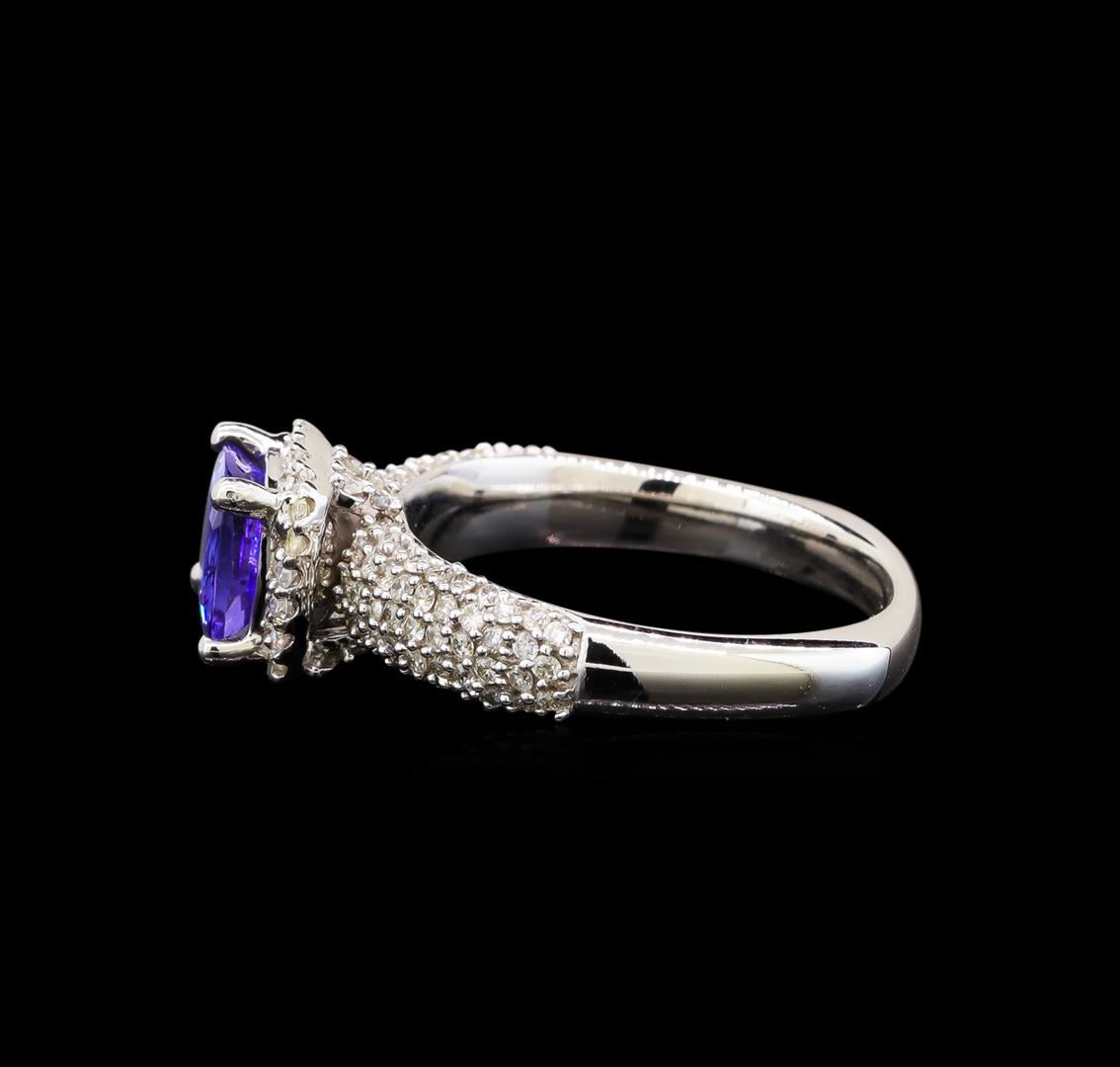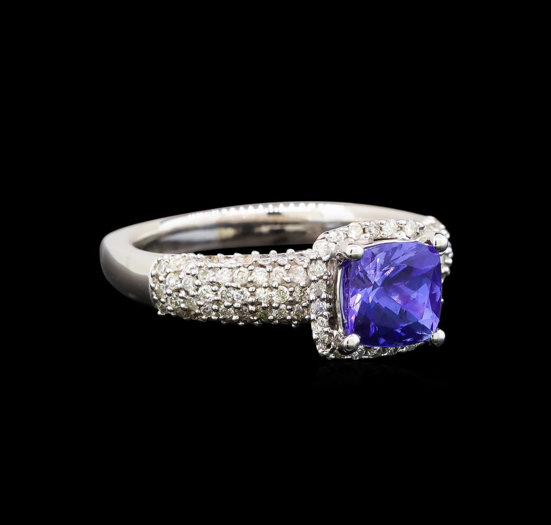 One electronically tested 14KT white gold ladies cast tanzanite and diamond ring with a flat shank with rounded edges with a bright polish finish. Trademark is Orianne. Identified with markings of "14K". Condition is new. Containing: One prong set square cushion modified brilliant cut natural tanzanite, measuring 6.50 x 6.47 x 4.55mm, approximate weight of 1.51ct., clarity is eye clean, type I, medium light, very slightly grayish, violet color, (GIA V 4/3), cut is good. One Hundred Twenty-Two prong set round brilliant cut diamonds, measuring 1.10 - 1.10 x 0.66mm (depth est.) approximate total weight of 122 Stones = 0.59ct. Clarity: I-1 to I-2. Color: I - J. All diamonds and colored gemstones are graded in the mounting, unless otherwise stated. Colored gemstones are presumed to have been subjected to commonly used enhancement processes.. Total Weight of Colored Stones 1.51ct. Total Weight of Diamonds 0.59ct. Total Weight of Ring 5.70 grams. GGL Appraised at $3,280.00.