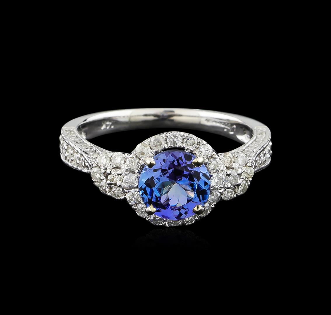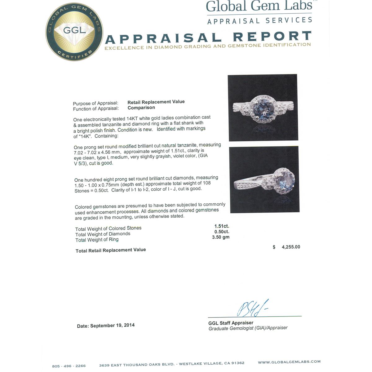 One electronically tested 14KT white gold ladies combination cast & assembled tanzanite and diamond ring with a flat shank with a bright polish finish. Identified with markings of "14K". Condition is new. Containing: One prong set round modified brilliant cut natural tanzanite, measuring 7.02 - 7.02 x 4.56 mm, approximate weight of 1.51ct., clarity is eye clean, type I, medium, very slightly grayish, violet color, (GIA V 5/3), cut is good. One Hundred Eight prong set round brilliant cut diamonds, measuring 1.50 - 1.00 x 0.75mm (depth est.) approximate total weight of 108 Stones = 0.50ct. Clarity: I-1 to I-2. Color: I - J, Cut is Good. Colored gemstones are presumed to have been subjected to commonly used enhancement processes. All diamonds and colored gemstones are graded in the mounting, unless otherwise stated. Total Weight of Colored Stones 1.51ct. Total Weight of Diamonds 0.50ct. Total Weight of Ring 3.50 grams. GGL Appraised at $4,255.00.