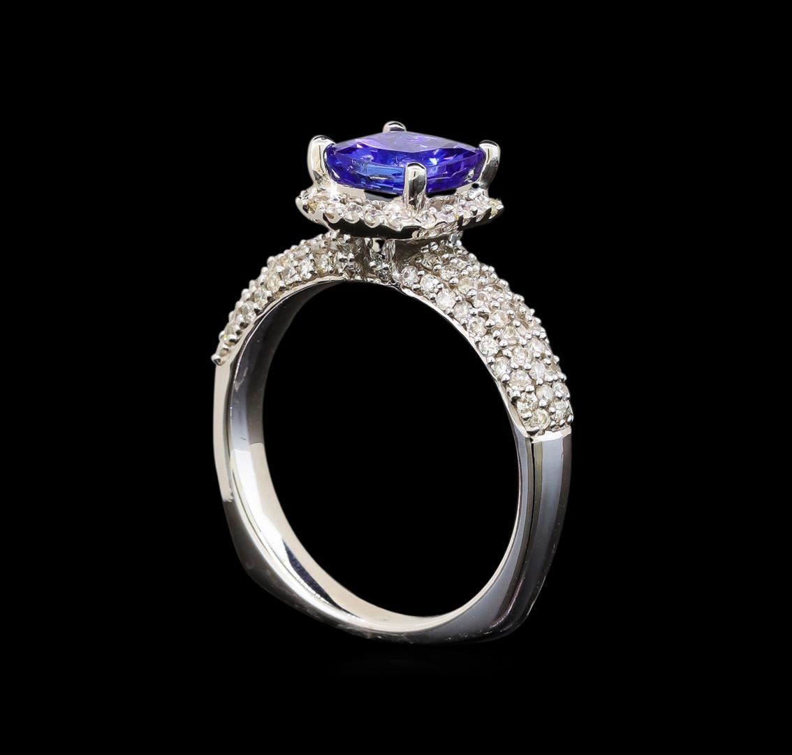 One electronically tested 14KT white gold ladies cast tanzanite and diamond ring with a flat shank with rounded edges with a bright polish finish. Trademark is Orianne. Identified with markings of "14K". Condition is new. Containing: One prong set square cushion modified brilliant cut natural tanzanite, measuring 6.50 x 6.47 x 4.55mm, approximate weight of 1.51ct., clarity is eye clean, type I, medium light, very slightly grayish, violet color, (GIA V 4/3), cut is good. One Hundred Twenty-Two prong set round brilliant cut diamonds, measuring 1.10 - 1.10 x 0.66mm (depth est.) approximate total weight of 122 Stones = 0.59ct. Clarity: I-1 to I-2. Color: I - J. All diamonds and colored gemstones are graded in the mounting, unless otherwise stated. Colored gemstones are presumed to have been subjected to commonly used enhancement processes.. Total Weight of Colored Stones 1.51ct. Total Weight of Diamonds 0.59ct. Total Weight of Ring 5.70 grams. GGL Appraised at $3,280.00.