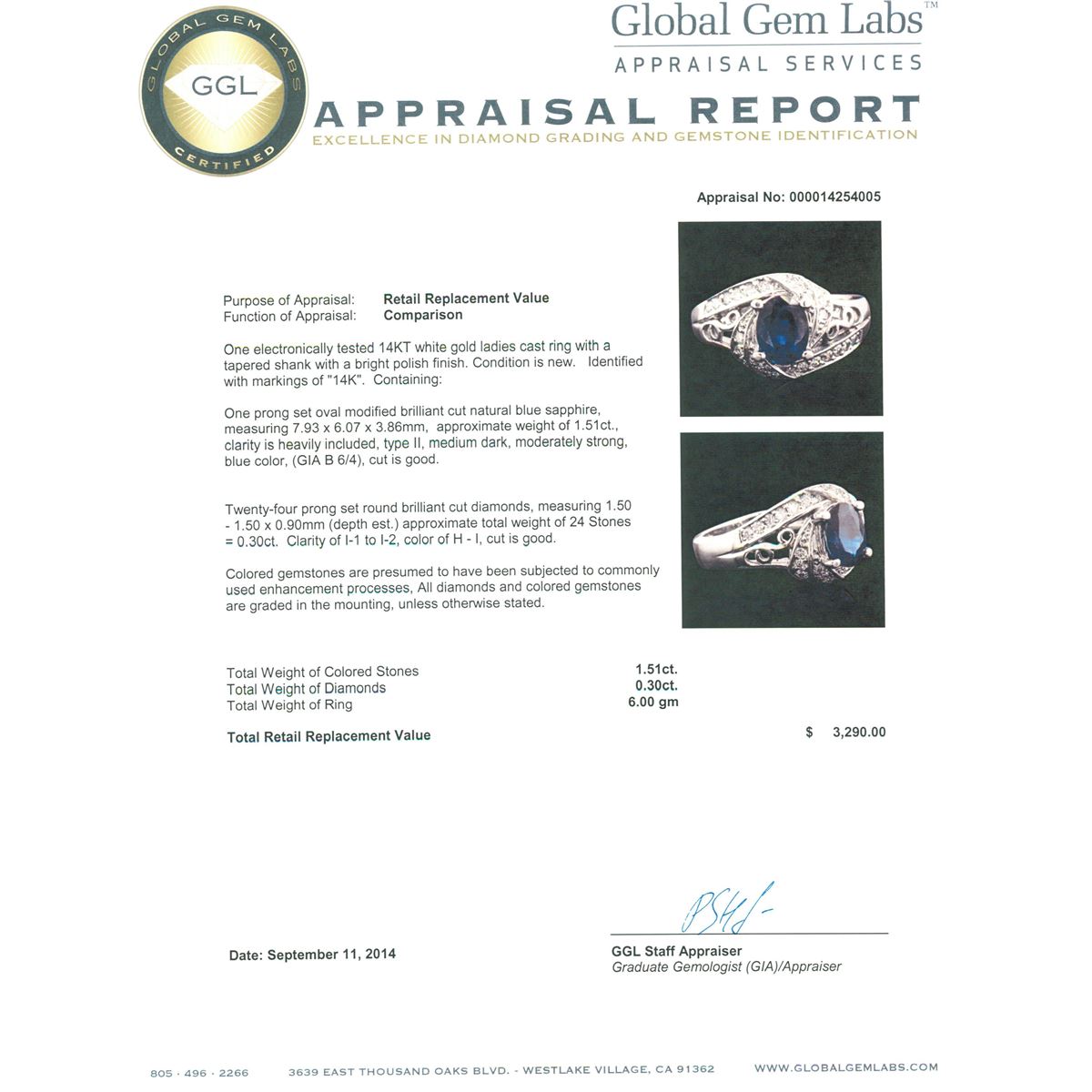 One electronically tested 14KT white gold ladies cast ring with a tapered shank with a bright polish finish. Identified with markings of "14K". Condition is new. Containing: One prong set oval modified brilliant cut natural blue sapphire, measuring 7.93 x 6.07 x 3.86mm, approximate weight of 1.51ct., clarity is heavily included, type II, medium dark, moderately strong, blue color, (GIA B 6/4), cut is good. Twenty-Four prong set round brilliant cut diamonds, measuring 1.50 - 1.50 x 0.90mm (depth est.) approximate total weight of 24 Stones = 0.30ct. Clarity: I-1 to I-2. Color: H - I, Cut is Good. Colored gemstones are presumed to have been subjected to commonly used enhancement processes, All diamonds and colored gemstones are graded in the mounting, unless otherwise stated. Total Weight of Colored Stones 1.51ct. Total Weight of Diamonds 0.30ct. Total Weight of Ring 6.00 grams. GGL Appraised at $3,290.00.