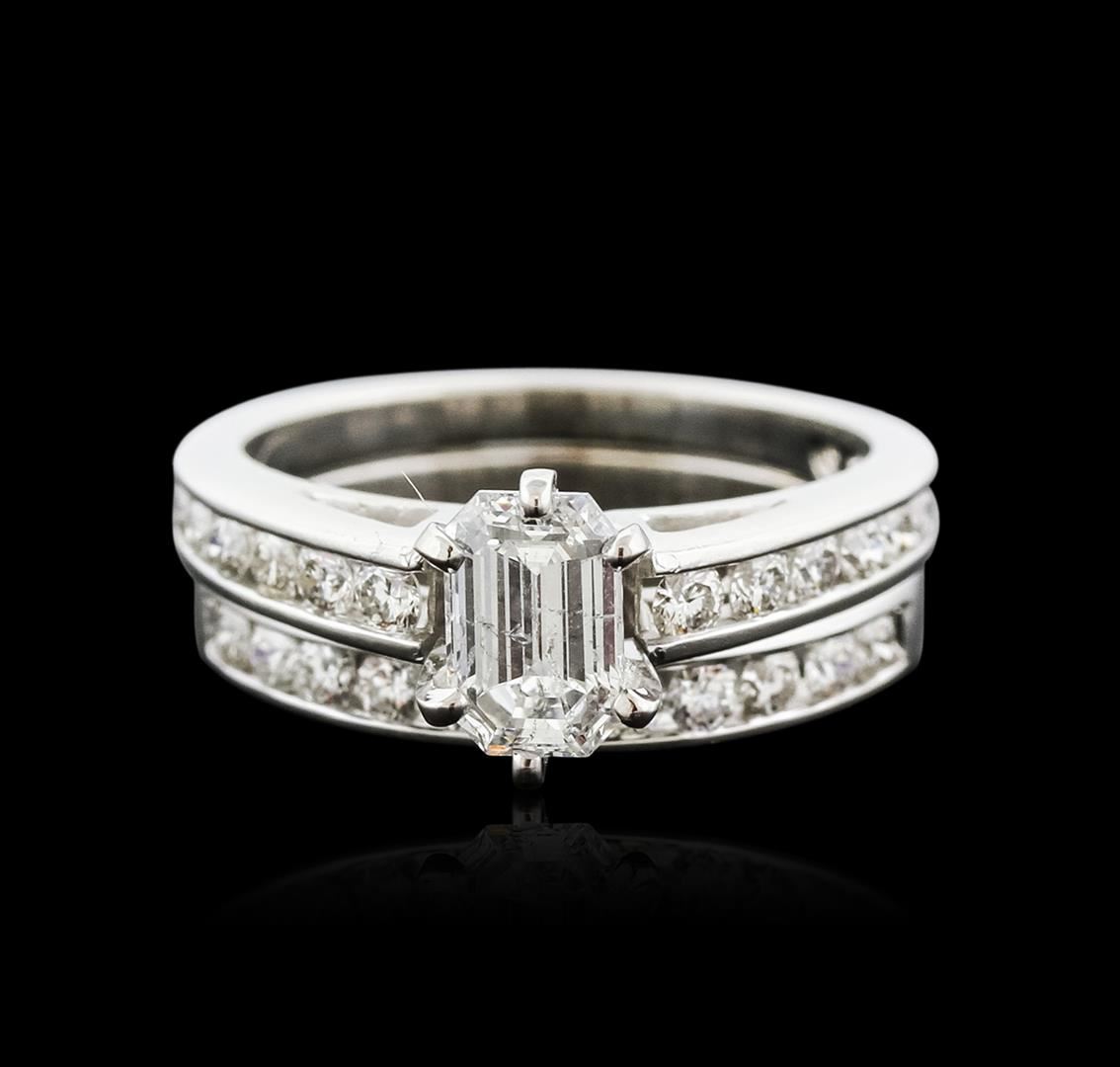 One pair electronically tested 14KT white gold ladies combination cast & assembled diamond engagement ring & wedding band with a flat shank with a bright polish finish. Trademark is LC. Identified with markings of "14K". Condition is new. Containing: One prong set emerald cut diamond, measuring 6.83 x 4.53 x 3.04mm (depth est.) approximate weight of 0.94ct. Clarity: SI-2. Color: G, Cut is Good. Twenty-Three channel set round brilliant cut diamonds, measuring 1.90 - 1.90 x 1.14mm (depth est.) approximate total weight of 23 Stones = 0.58ct. Clarity: SI-1. Color: G - H, Cut is Good. All diamonds are graded in the mounting, unless otherwise stated. Total Weight of Diamonds 1.52ct. Total Weight of Engagement Ring & Wedding Band 6.50 grams. GGL Appraised at $6,240.00.