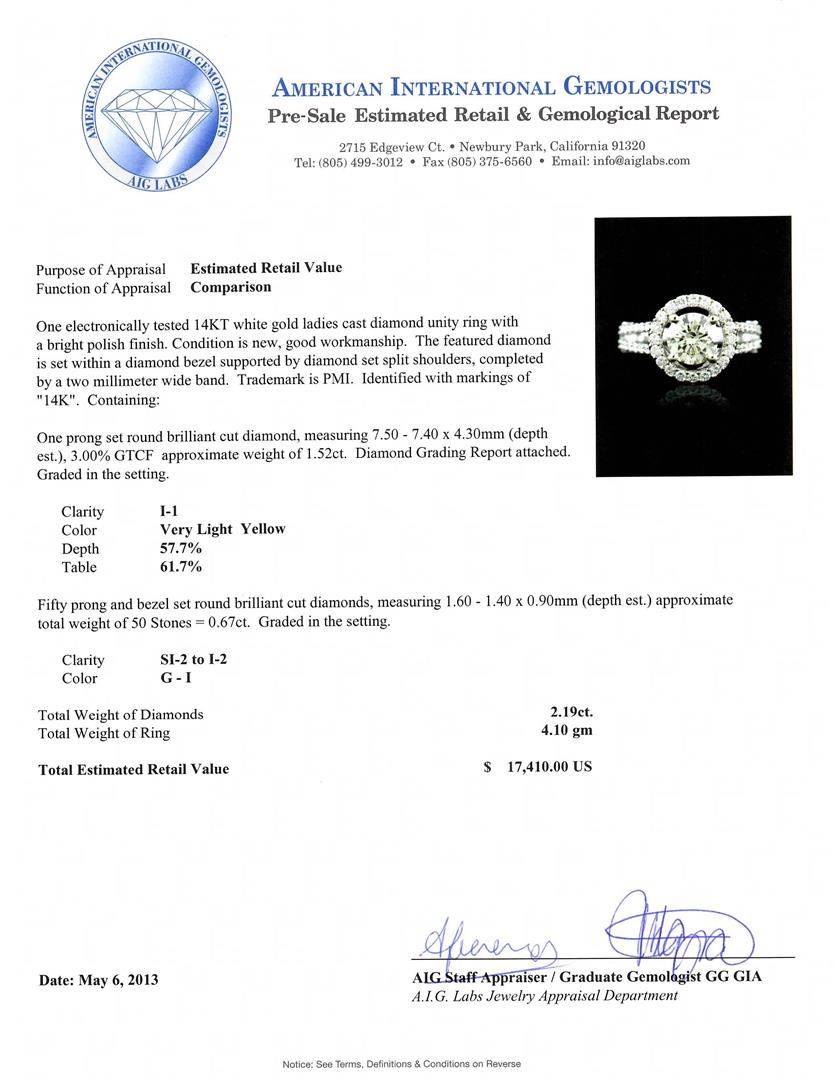 14KT White Gold 1.52ct I-1/Very Light Yellow Diamond Ring A4855. One electronically tested 14KT white gold ladies cast diamond unity ring with a bright polish finish. Condition is new, good workmanship. The featured diamond is set within a diamond bezel supported by diamond set split shoulders, completed by a two millimeter wide band. Trademark is PMI. Identified with markings of "14K". Containing: One prong set round brilliant cut diamond, measuring 7.50 - 7.40 x 4.30mm (depth est.), 3.00% GTCF approximate weight og 1.52ct. Diamond Grading Report attached. Graded in the setting. Clarity I-1. Color Very Light Yellow. Depth 57.7%. Table 61.7%. Fifty prong and bezel set round brilliant cut diamonds, measuring 1.60 - 1.40 x 0.90mm (depth est.) approximate total weight of 50 Stones = 0.67ct. Graded in the setting. Clarity SI-2 to I-2. Color G - I. Total weight of Diamonds 2.19ct. Total Weight of Ring 4.10 gm. AIG Appraised.