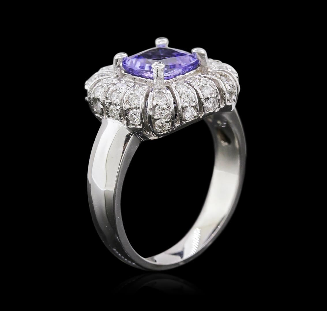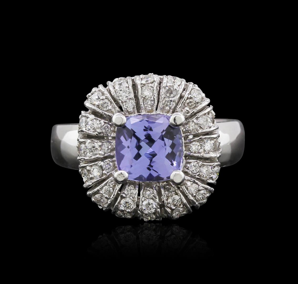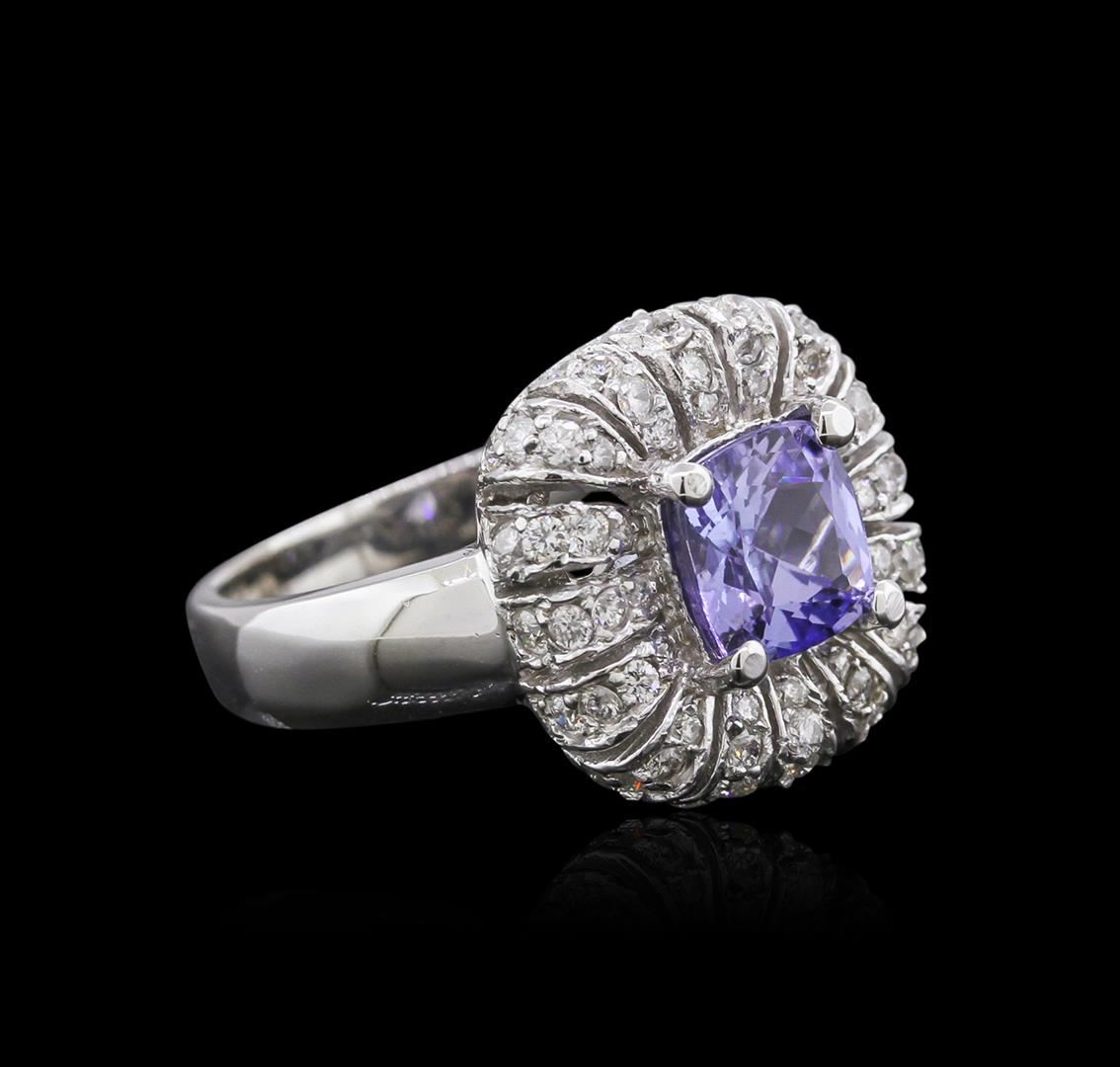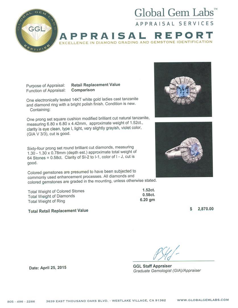 One electronically tested 14KT white gold ladies cast tanzanite and diamond ring with a bright polish finish. Condition is new. Containing: One prong set square cushion modified brilliant cut natural tanzanite, measuring 6.80 x 6.80 x 4.42mm, approximate weight of 1.52ct., clarity is eye clean, type I, light, very slightly grayish, violet color, (GIA V 3/3), cut is good. Sixty-Four prong set round brilliant cut diamonds, measuring 1.30 - 1.30 x 0.78mm (depth est.) approximate total weight of 64 Stones = 0.58ct. Clarity: SI-2 to I-1. Color: I - J, Cut is Good. Colored gemstones are presumed to have been subjected to commonly used enhancement processes. All diamonds and colored gemstones are graded in the mounting, unless otherwise stated. Total Weight of Colored Stones 1.52ct. Total Weight of Diamonds 0.58ct. Total Weight of Ring 6.20 grams. GGL Appraised at $2,870.00.