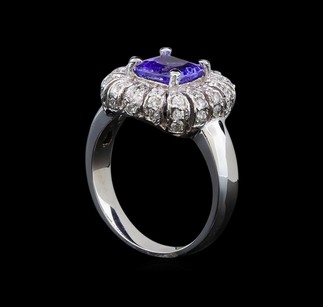 One electronically tested 14KT white gold ladies cast tanzanite and diamond ring with a bright polish finish. Condition is new. Containing: One prong set square cushion modified brilliant cut natural tanzanite, measuring 6.80 x 6.80 x 4.42mm, approximate weight of 1.52ct., clarity is eye clean, type I, light, very slightly grayish, violet color, (GIA V 3/3), cut is good. Sixty-Four prong set round brilliant cut diamonds, measuring 1.30 - 1.30 x 0.78mm (depth est.) approximate total weight of 64 Stones = 0.58ct. Clarity: SI-2 to I-1. Color: I - J, Cut is Good. Colored gemstones are presumed to have been subjected to commonly used enhancement processes. All diamonds and colored gemstones are graded in the mounting, unless otherwise stated. Total Weight of Colored Stones 1.52ct. Total Weight of Diamonds 0.58ct. Total Weight of Ring 6.20 grams. GGL Appraised at $2,870.00.