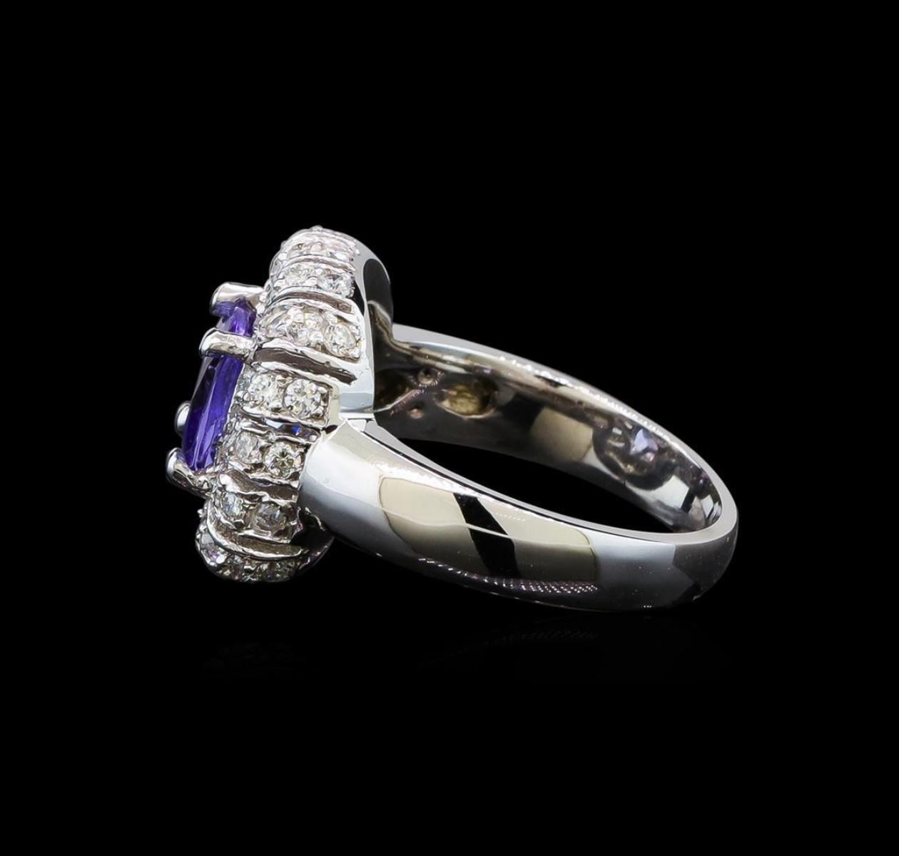 One electronically tested 14KT white gold ladies cast tanzanite and diamond ring with a bright polish finish. Condition is new. Containing: One prong set square cushion modified brilliant cut natural tanzanite, measuring 6.80 x 6.80 x 4.42mm, approximate weight of 1.52ct., clarity is eye clean, type I, light, very slightly grayish, violet color, (GIA V 3/3), cut is good. Sixty-Four prong set round brilliant cut diamonds, measuring 1.30 - 1.30 x 0.78mm (depth est.) approximate total weight of 64 Stones = 0.58ct. Clarity: SI-2 to I-1. Color: I - J, Cut is Good. Colored gemstones are presumed to have been subjected to commonly used enhancement processes. All diamonds and colored gemstones are graded in the mounting, unless otherwise stated. Total Weight of Colored Stones 1.52ct. Total Weight of Diamonds 0.58ct. Total Weight of Ring 6.20 grams. GGL Appraised.