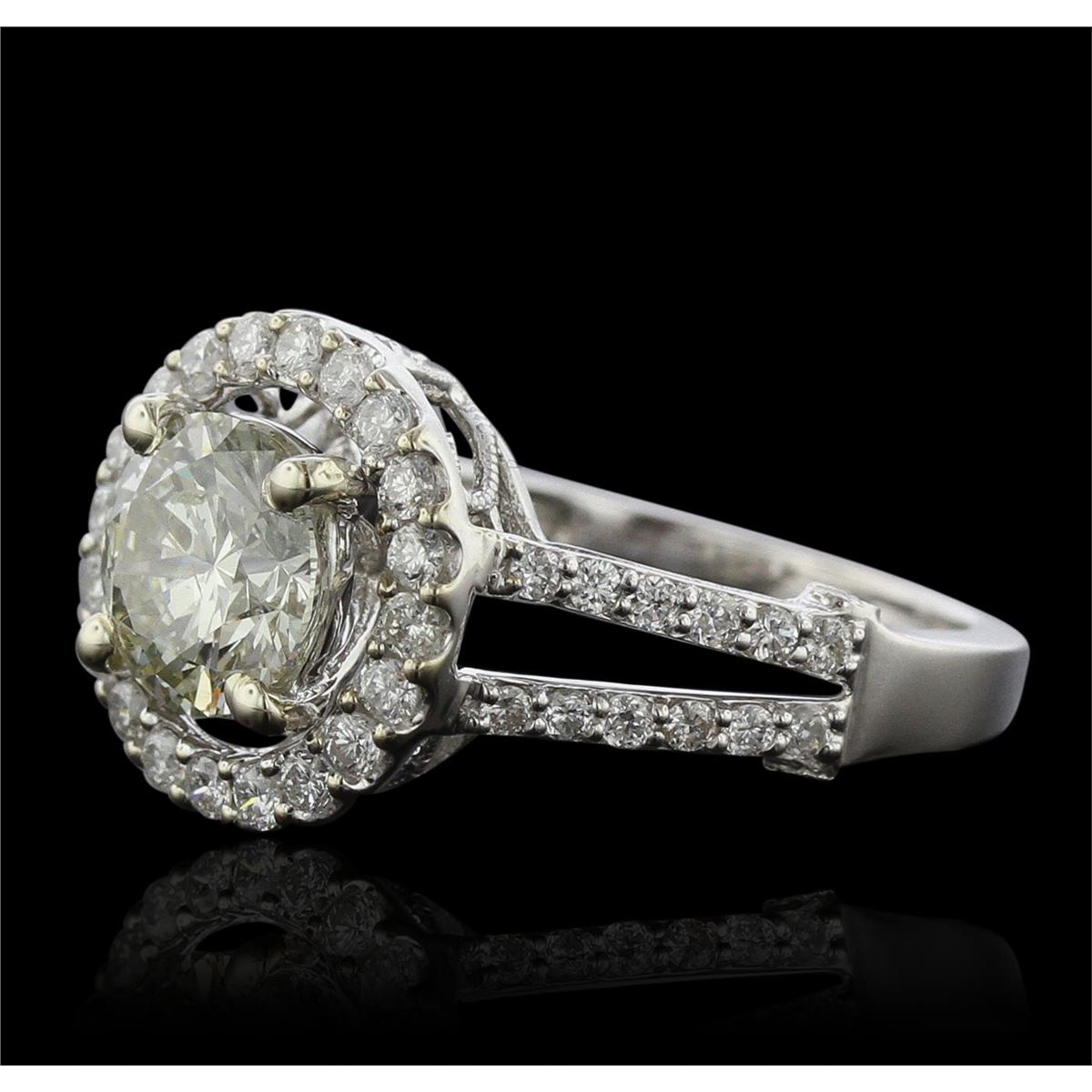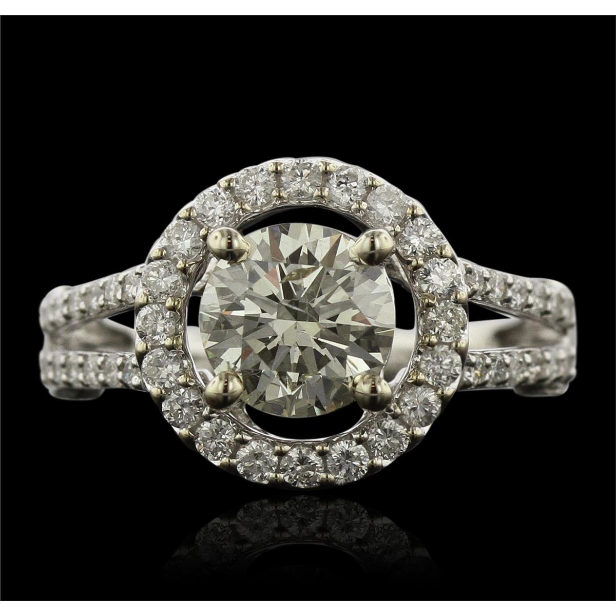 14KT White Gold 1.52ct I-1/Very Light Yellow Diamond Ring A4855. One electronically tested 14KT white gold ladies cast diamond unity ring with a bright polish finish. Condition is new, good workmanship. The featured diamond is set within a diamond bezel supported by diamond set split shoulders, completed by a two millimeter wide band. Trademark is PMI. Identified with markings of "14K". Containing: One prong set round brilliant cut diamond, measuring 7.50 - 7.40 x 4.30mm (depth est.), 3.00% GTCF approximate weight og 1.52ct. Diamond Grading Report attached. Graded in the setting. Clarity I-1. Color Very Light Yellow. Depth 57.7%. Table 61.7%. Fifty prong and bezel set round brilliant cut diamonds, measuring 1.60 - 1.40 x 0.90mm (depth est.) approximate total weight of 50 Stones = 0.67ct. Graded in the setting. Clarity SI-2 to I-2. Color G - I. Total weight of Diamonds 2.19ct. Total Weight of Ring 4.10 gm. AIG Appraised at $17,410.00.