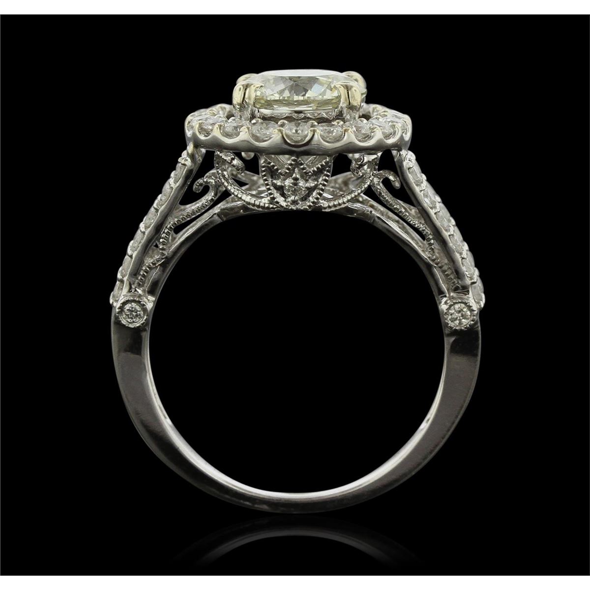 14KT White Gold 1.52ct I-1/Very Light Yellow Diamond Ring A4855. One electronically tested 14KT white gold ladies cast diamond unity ring with a bright polish finish. Condition is new, good workmanship. The featured diamond is set within a diamond bezel supported by diamond set split shoulders, completed by a two millimeter wide band. Trademark is PMI. Identified with markings of "14K". Containing: One prong set round brilliant cut diamond, measuring 7.50 - 7.40 x 4.30mm (depth est.), 3.00% GTCF approximate weight og 1.52ct. Diamond Grading Report attached. Graded in the setting. Clarity I-1. Color Very Light Yellow. Depth 57.7%. Table 61.7%. Fifty prong and bezel set round brilliant cut diamonds, measuring 1.60 - 1.40 x 0.90mm (depth est.) approximate total weight of 50 Stones = 0.67ct. Graded in the setting. Clarity SI-2 to I-2. Color G - I. Total weight of Diamonds 2.19ct. Total Weight of Ring 4.10 gm. AIG Appraised at $17,410.00.