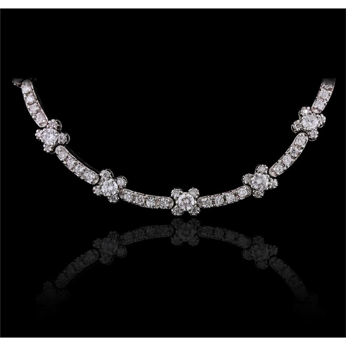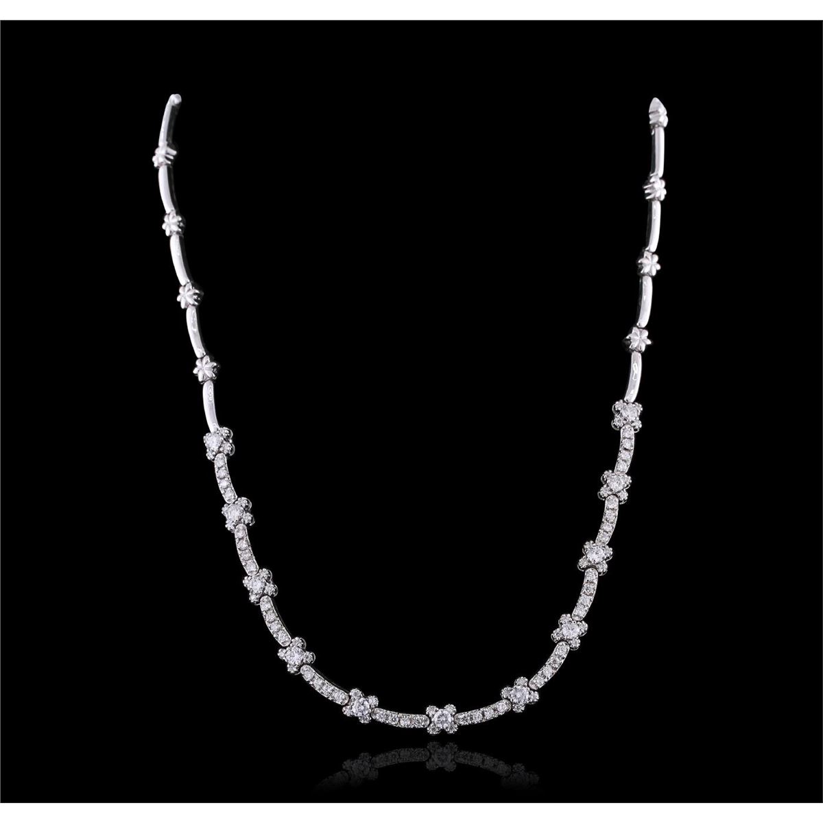One electronically tested 14KT white gold ladies combination cast & assembled necklace with a hidden box clasp with a bright polish finish. Condition is new. Measurements: 16" in length. Identified with markings of "14K". Containing: Eleven prong set round brilliant cut diamonds, measuring 2.30 - 2.30 x 1.38mm (depth est.) approximate. Total Weight of 11 Stones = 0.49ct. Clarity: SI-1 to I-1. Color: G - H, Cut is Good. Eighty-Four prong set round brilliant cut diamonds, measuring 1.50 - 1.50 x 0.90mm (depth est.) approximate. Total Weight of 84 Stones = 1.03ct. Clarity: SI-1 to I-1. Color: G - H, Cut is Good. All diamonds are graded in the mounting, unless otherwise stated. Total Weight of Diamonds 1.52ct. Total Weight of Necklace 28.60 grams. GGL Appraised at $14,675.00.