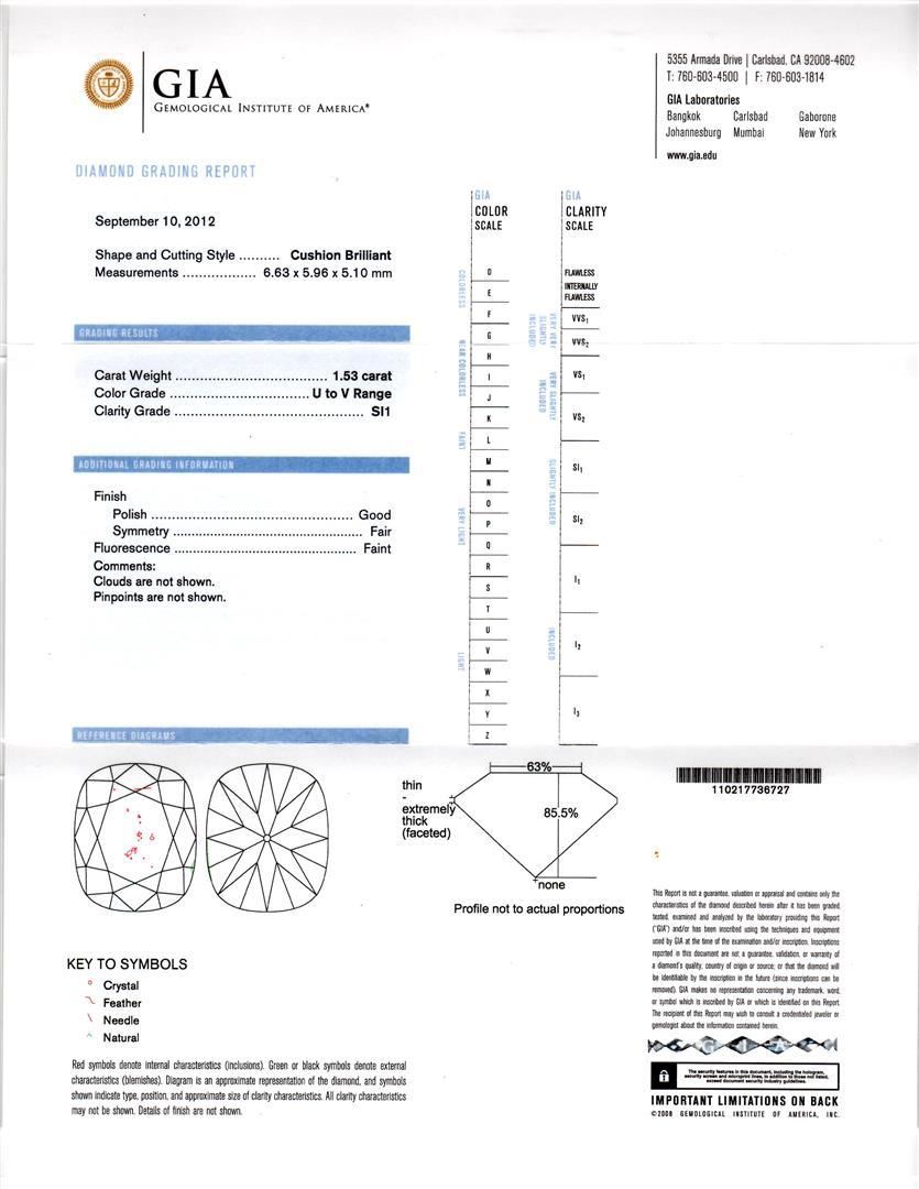 Great Condition! KJ1574YT. One electronically tested 14KT white gold ladies cast diamond unity ring with a bright polish finish. Condition is new, good workmanship. The featured diamond is within a yellow gold basket and place within a diamond bezel. The ring is supported by diamond set shoulders, completed by a one and one-half millimeter wide band. Identified with markings of "14K". Containing: One prong set cushion cut diamond, measuring 6.63 x 5.96 x 5.10mm exact weight 1.53ct with a faint fluorescence. Graded loose prior to setting in the GIA Laboratory, Report #2145972182. Clarity SI-1. Color U - V. Depth 85.6%. Table 63.0%. Thirty-eight prong set round brilliant cut diamonds, measuring 1.40 - 1.20 x 0.78mm (depth est.) approximate total weight of 38 Stones = 0.31ct. Graded in the setting. Clarity VS-VS-1 to VS- 2. Color G - I. Total Weight of Diamonds 1.84ct. Total Weight of Ring 3.14gm. AIG Appraised at $14,625.00. GIA Appraised.