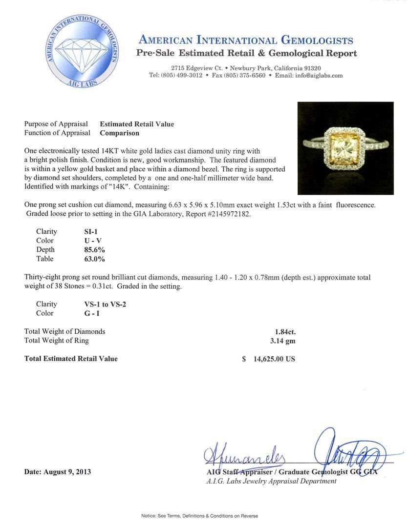 Great Condition! KJ1574YT. One electronically tested 14KT white gold ladies cast diamond unity ring with a bright polish finish. Condition is new, good workmanship. The featured diamond is within a yellow gold basket and place within a diamond bezel. The ring is supported by diamond set shoulders, completed by a one and one-half millimeter wide band. Identified with markings of "14K". Containing: One prong set cushion cut diamond, measuring 6.63 x 5.96 x 5.10mm exact weight 1.53ct with a faint fluorescence. Graded loose prior to setting in the GIA Laboratory, Report #2145972182. Clarity SI-1. Color U - V. Depth 85.6%. Table 63.0%. Thirty-eight prong set round brilliant cut diamonds, measuring 1.40 - 1.20 x 0.78mm (depth est.) approximate total weight of 38 Stones = 0.31ct. Graded in the setting. Clarity VS-VS-1 to VS- 2. Color G - I. Total Weight of Diamonds 1.84ct. Total Weight of Ring 3.14gm. AIG Appraised at $14,625.00. GIA Appraised.