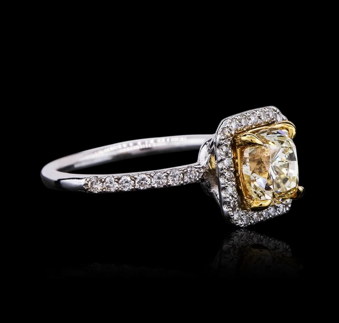 Great Condition! KJ1574YT. One electronically tested 14KT white gold ladies cast diamond unity ring with a bright polish finish. Condition is new, good workmanship. The featured diamond is within a yellow gold basket and place within a diamond bezel. The ring is supported by diamond set shoulders, completed by a one and one-half millimeter wide band. Identified with markings of "14K". Containing: One prong set cushion cut diamond, measuring 6.63 x 5.96 x 5.10mm exact weight 1.53ct with a faint fluorescence. Graded loose prior to setting in the GIA Laboratory, Report #2145972182. Clarity SI-1. Color U - V. Depth 85.6%. Table 63.0%. Thirty-eight prong set round brilliant cut diamonds, measuring 1.40 - 1.20 x 0.78mm (depth est.) approximate total weight of 38 Stones = 0.31ct. Graded in the setting. Clarity VS-VS-1 to VS- 2. Color G - I. Total Weight of Diamonds 1.84ct. Total Weight of Ring 3.14gm. AIG Appraised at $14,625.00. GIA Appraised.