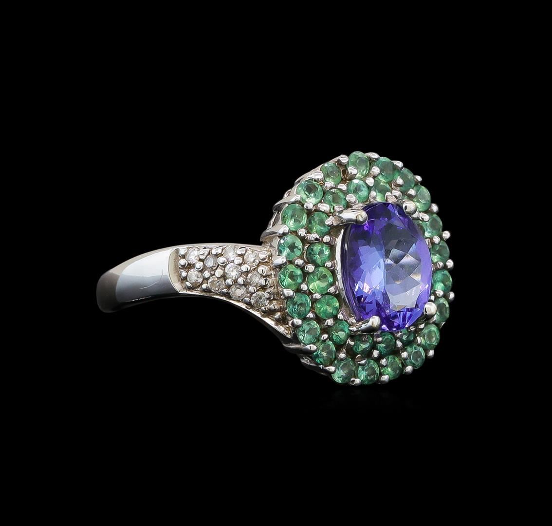 One electronically tested 14KT white gold ladies cast tanzanite, emerald and diamond ring with a bright polish finish. Identified with markings of "14K". Condition is new. Containing: One prong set oval modified brilliant cut natural tanzanite, measuring 9.30 x 6.00 x 3.91mm, approximate weight of 1.53ct., clarity is eye clean, type I, medium light, slightly grayish, violet color, (GIA V 4/2), cut is good. Thirty-seven prong set round modified brilliant cut natural emeralds, measuring 1.50 - 1.50 x 0.98 mm, approximate total weight of 0.37ct., clarity is slightly included, type III, medium, very slightly grayish, green color, (GIA G 5/3), cut is good. Twenty prong set round brilliant cut diamonds, measuring 1.20 - 1.20 x 0.72mm (depth est.) approximate total weight of 20 Stones = 0.13ct. Clarity: I-1 to I-2. Color: I - J, Cut is Good. Colored gemstones are presumed to have been subjected to commonly used enhancement processes. All diamonds and colored gemstones are graded in the mounting, unless otherwise stated. Total Weight of Colored Stones 1.90ct. Total Weight of Diamonds 0.13ct. Total Weight of Ring 4.20 grams. GGL Appraised at $2,030.00.