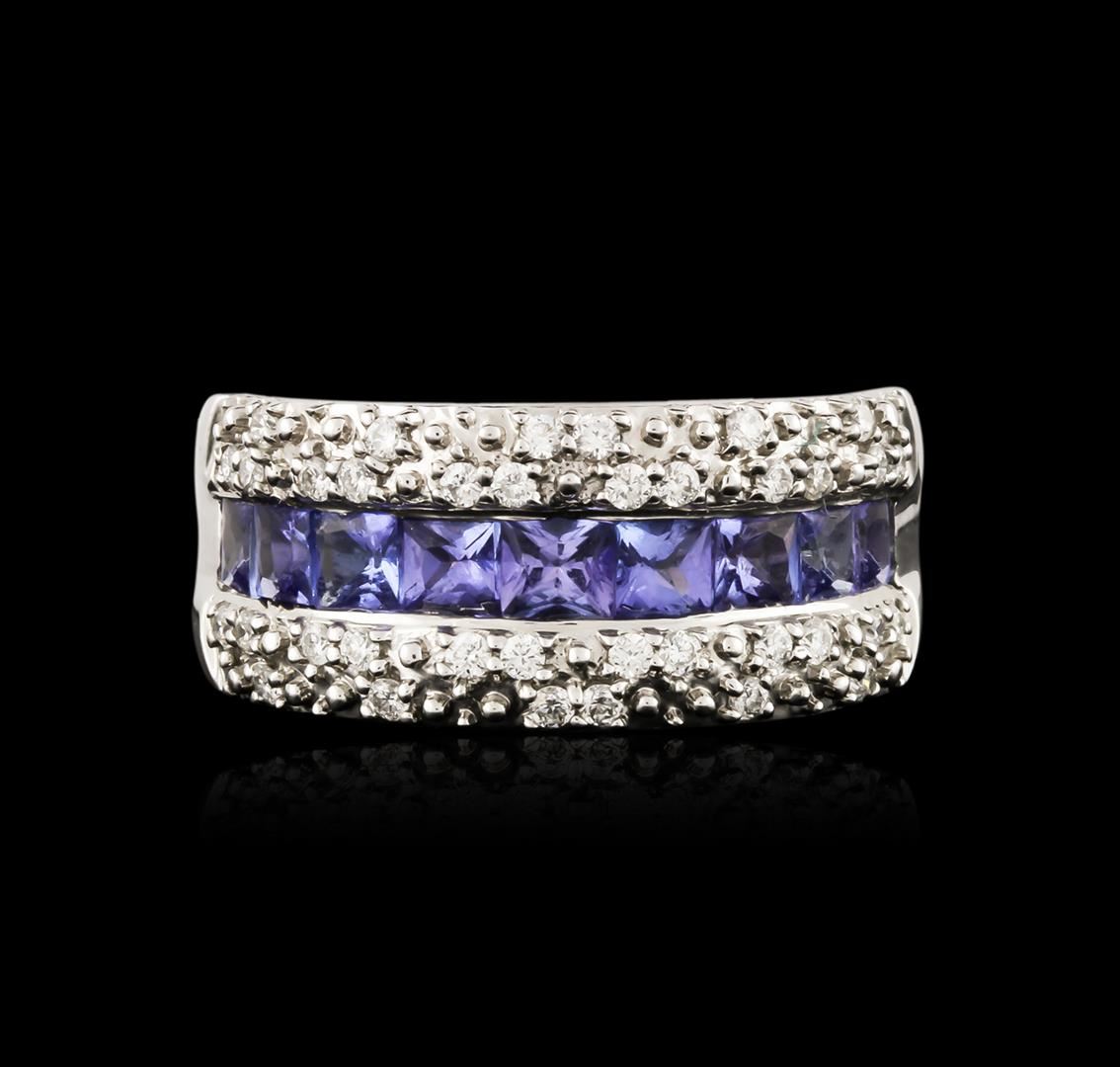 One electronically tested 14KT white gold ladies cast tanzanite and diamond ring with a bright polish finish. The ring features a tanzanite ribbon supported by mirroring diamond ribbons, terminating in a two and one-half millimeter wide band. Identified with markings of "14K". Condition is new, good workmanship. Containing: Nine channel set princess mixed cut natural tanzanites, measuring 3.20 x 3.00 x 1.95mm, 6%. bulge factor, approximate total weight of 1.53ct., clarity is eye clean, type I, medium dark, moderately strong, bluish violet color, (GIA bV 6/4), cut is good. Transmitting light with no distortion, transparent. Measurements & the color grade are an average for the group. Graded in the setting. Tanzanite is a very rare gemstone that is only found in the country of Tanzania. Originally discovered in 1967. Tiffany & Company, named the stone Tanzanite. It is found in the Usumburu Mountains that border the Umba Valley of northern Tanzania. Tanzanite occurs in gray, brown, violet, blue, reddish-purple, & green. The gem is interesting because of its exceptional pleochroism. Rotated in different directions a tanzanite will exhibit multiple changes of color. Tanzanite has a low tolerance to ultrasonic cleaning, and should not be cleaned using this method. Thirty-Six prong set round brilliant cut diamonds, measuring 1.50 - 1.40 x 0.87mm (depth est.) approximate total weight of 36 Stones = 0.40ct. Graded in the setting. Clarity: VS-1 to VS-2. Color: G - I. Total Weight of Colored Stones 1.53ct. Total Weight of Diamonds 0.40ct. Total Weight of Ring 6.26 grams. AIG Appraised at $3,635.00.