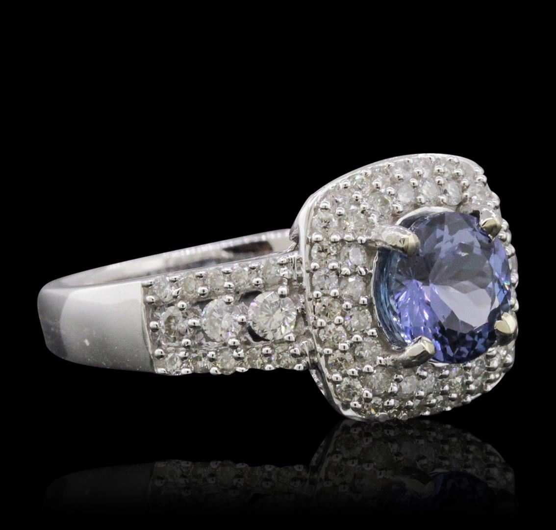 One electronically tested 14KT white gold ladies combination cast & assembled tanzanite and diamond ring with a flat shank with a bright polish finish. Identified with markings of "14K". Condition is new. Containing: One prong set round modified brilliant cut natural tanzanite, measuring 7.00 - 7.00 x 4.67 mm, approximate weight of 1.53ct., clarity is eye clean, type I, medium light, very slightly grayish, violet color, (GIA V 4/3), cut is very good. Six prong set round brilliant cut diamonds, measuring 2.20 - 1.60 x 1.14mm (depth est.) approximate total weight of 6 Stones = 0.15ct. Clarity: SI-1 to I-1. Color: H - I, Cut is Good. Seventy-One prong set round brilliant cut diamonds, measuring 1.10 - 1.10 x 0.66mm (depth est.) approximate total weight of 71 Stones = 0.34ct. Clarity: I-1 to I-2. Color: H - I, Cut is Good. Colored gemstones are presumed to have been subjected to commonly used enhancement processes. All diamonds and colored gemstones are graded in the mounting, unless otherwise stated. Total Weight of Colored Stones 1.53ct. Total Weight of Diamonds 0.49ct. Total Weight of Ring 5.50 grams. GGL Appraised at $6,290.00.