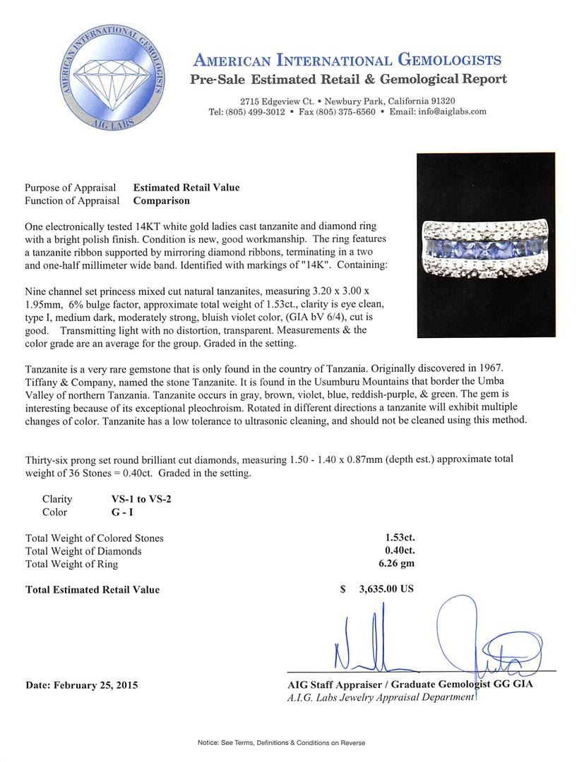 One electronically tested 14KT white gold ladies cast tanzanite and diamond ring with a bright polish finish. The ring features a tanzanite ribbon supported by mirroring diamond ribbons, terminating in a two and one-half millimeter wide band. Identified with markings of "14K". Condition is new, good workmanship. Containing: Nine channel set princess mixed cut natural tanzanites, measuring 3.20 x 3.00 x 1.95mm, 6%. bulge factor, approximate total weight of 1.53ct., clarity is eye clean, type I, medium dark, moderately strong, bluish violet color, (GIA bV 6/4), cut is good. Transmitting light with no distortion, transparent. Measurements & the color grade are an average for the group. Graded in the setting. Tanzanite is a very rare gemstone that is only found in the country of Tanzania. Originally discovered in 1967. Tiffany & Company, named the stone Tanzanite. It is found in the Usumburu Mountains that border the Umba Valley of northern Tanzania. Tanzanite occurs in gray, brown, violet, blue, reddish-purple, & green. The gem is interesting because of its exceptional pleochroism. Rotated in different directions a tanzanite will exhibit multiple changes of color. Tanzanite has a low tolerance to ultrasonic cleaning, and should not be cleaned using this method. Thirty-Six prong set round brilliant cut diamonds, measuring 1.50 - 1.40 x 0.87mm (depth est.) approximate total weight of 36 Stones = 0.40ct. Graded in the setting. Clarity: VS-1 to VS-2. Color: G - I. Total Weight of Colored Stones 1.53ct. Total Weight of Diamonds 0.40ct. Total Weight of Ring 6.26 grams. AIG Appraised at $3,635.00.