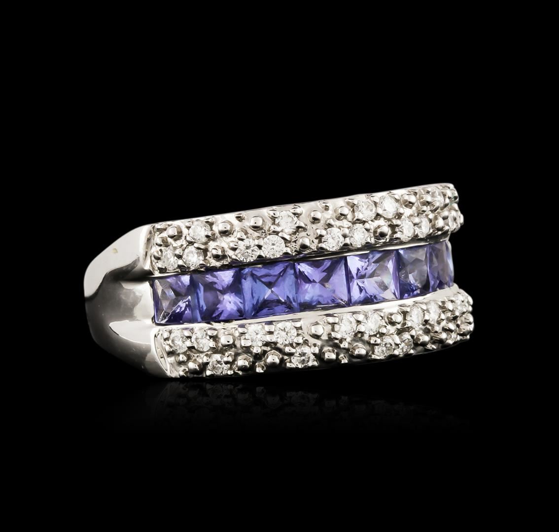 One electronically tested 14KT white gold ladies cast tanzanite and diamond ring with a bright polish finish. The ring features a tanzanite ribbon supported by mirroring diamond ribbons, terminating in a two and one-half millimeter wide band. Identified with markings of "14K". Condition is new, good workmanship. Containing: Nine channel set princess mixed cut natural tanzanites, measuring 3.20 x 3.00 x 1.95mm, 6%. bulge factor, approximate total weight of 1.53ct., clarity is eye clean, type I, medium dark, moderately strong, bluish violet color, (GIA bV 6/4), cut is good. Transmitting light with no distortion, transparent. Measurements & the color grade are an average for the group. Graded in the setting. Tanzanite is a very rare gemstone that is only found in the country of Tanzania. Originally discovered in 1967. Tiffany & Company, named the stone Tanzanite. It is found in the Usumburu Mountains that border the Umba Valley of northern Tanzania. Tanzanite occurs in gray, brown, violet, blue, reddish-purple, & green. The gem is interesting because of its exceptional pleochroism. Rotated in different directions a tanzanite will exhibit multiple changes of color. Tanzanite has a low tolerance to ultrasonic cleaning, and should not be cleaned using this method. Thirty-Six prong set round brilliant cut diamonds, measuring 1.50 - 1.40 x 0.87mm (depth est.) approximate total weight of 36 Stones = 0.40ct. Graded in the setting. Clarity: VS-1 to VS-2. Color: G - I. Total Weight of Colored Stones 1.53ct. Total Weight of Diamonds 0.40ct. Total Weight of Ring 6.26 grams. AIG Appraised at $3,635.00.