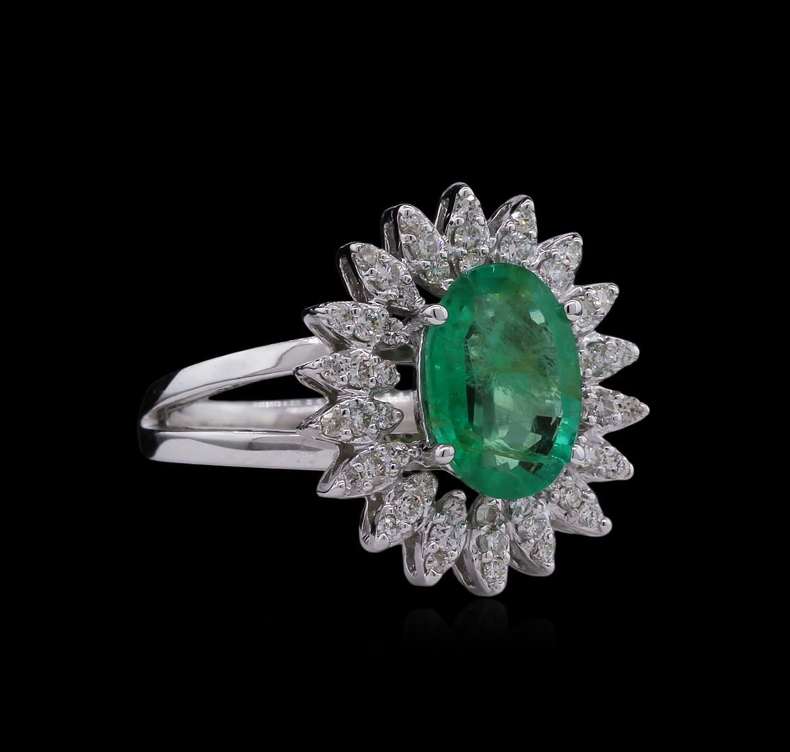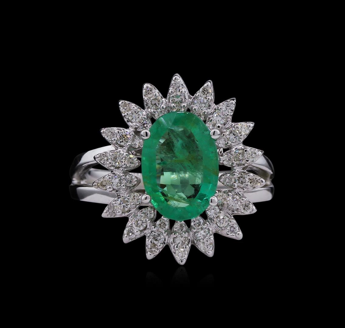 One electronically tested 14KT white gold Ladies combination cast & assembled ring with a bright polish finish. Condition is new. Identified with markings of "14K". Containing: One prong set oval modified brilliant cut natural emerald, measuring 10.00 x 7.30 x 3.75mm, approximate weight of 1.53ct., clarity is moderately included, type III, medium light, very slightly grayish, very slightly bluish green color, (GIA vslbG 4/3), cut is good. Colored gemstones are presumed to have been subjected to commonly used and possible undetectable color/clarity enhancement processes. Fifty-Four prong set round brilliant cut diamonds, measuring 1.30 - 1.00 x 0.69mm (depth est.) approximate total weight of 54 Stones = 0.30ct. Clarity of SI-1 to SI-2, Color of I - J, Cut is Good. Total Weight of Colored Stones 1.53ct. Total Weight of Diamonds 0.30ct. Total Weight of Ring 5.80gm. GGL Appraised at $8,275.00.