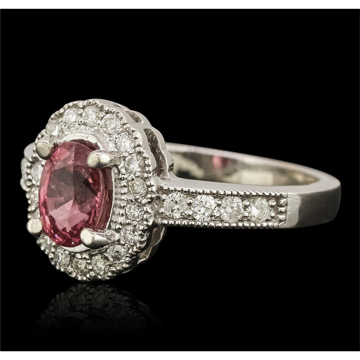 One electronically tested 14KT white gold ladies cast pink sapphire & diamond ring with a bright finish. The pink sapphire is set within a diamond bezel, supported by diamond set shoulders, completed by a two millimeter wide band. Bright polish finish, with milgrain detailing throughout. Identified with markings of "14K". Condition is new, good workmanship. Containing: One prong set oval mixed cut natural pink sapphire, measuring 7.00 x 5.40 x 4.00mm, approximate weight of 1.53ct., clarity is moderately included, dark, slightly grayish, pink color, (GIA Pk 7/2), cut is good. Transmitting light with no distortion, transparent. Naturally occurring internal & external characteristics are present. Graded in the setting. Twenty-Six prong set round brilliant cut diamonds, measuring 1.80 - 1.40 x 0.96mm (depth est.) approximate. Total Weight of 26 Stones = 0.38ct. Graded in the setting. Clarity: SI-2 to I-1. Color: G - I. Total Weight of Colored Stones 1.53ct. Total Weight of Diamonds 0.38ct. Total Weight of Ring 4.44gm. AIG Appraised at $3,600.00.