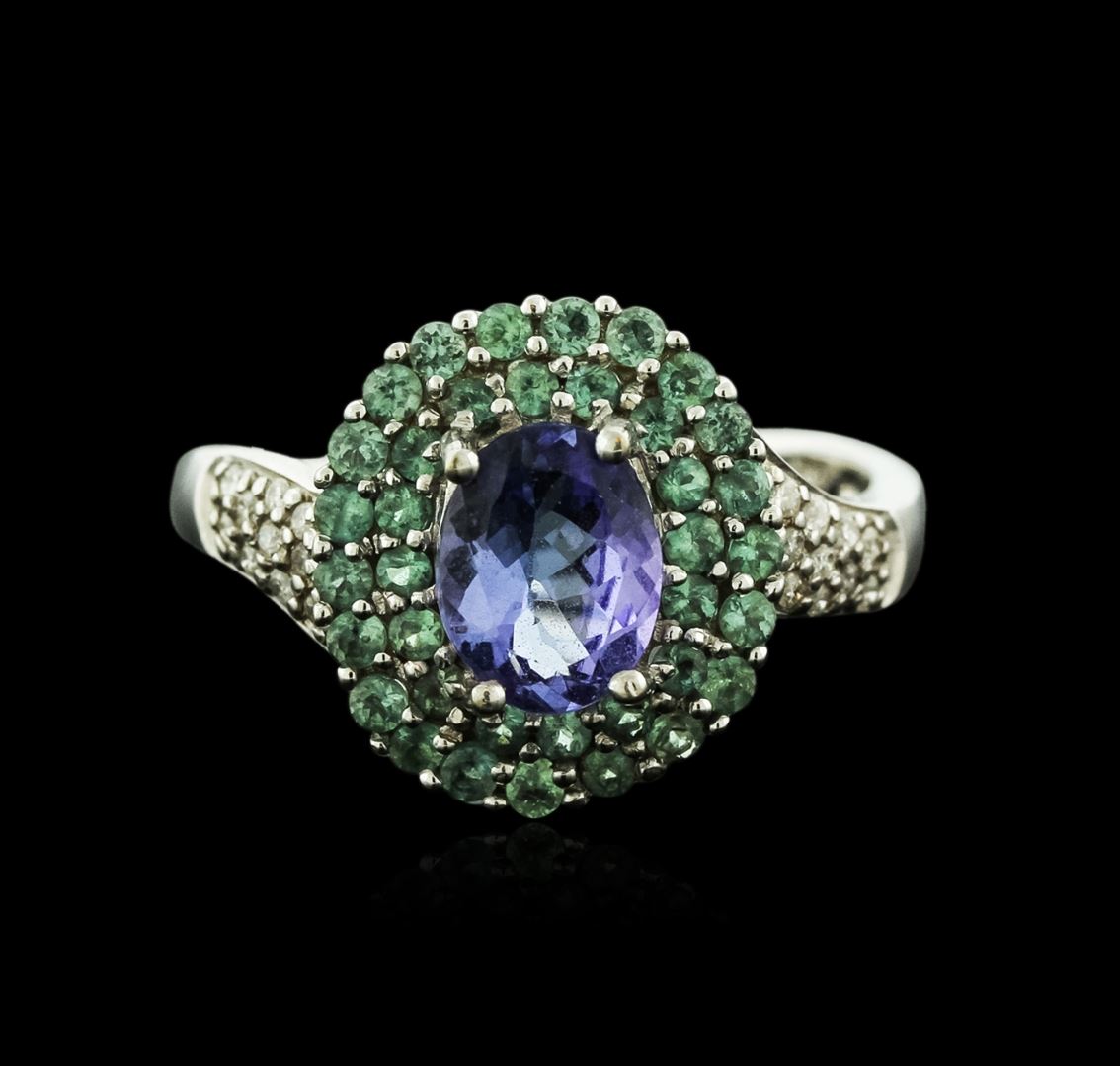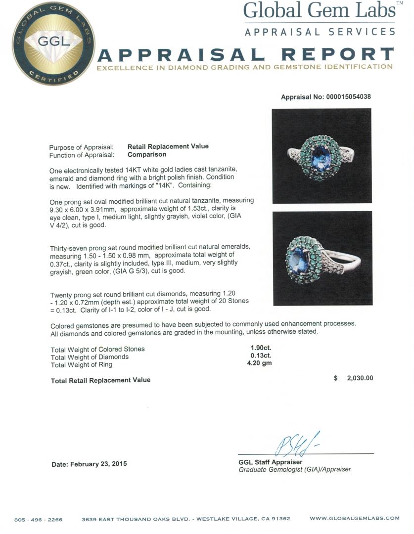 One electronically tested 14KT white gold ladies cast tanzanite, emerald and diamond ring with a bright polish finish. Identified with markings of "14K". Condition is new. Containing: One prong set oval modified brilliant cut natural tanzanite, measuring 9.30 x 6.00 x 3.91mm, approximate weight of 1.53ct., clarity is eye clean, type I, medium light, slightly grayish, violet color, (GIA V 4/2), cut is good. Thirty-seven prong set round modified brilliant cut natural emeralds, measuring 1.50 - 1.50 x 0.98 mm, approximate total weight of 0.37ct., clarity is slightly included, type III, medium, very slightly grayish, green color, (GIA G 5/3), cut is good. Twenty prong set round brilliant cut diamonds, measuring 1.20 - 1.20 x 0.72mm (depth est.) approximate total weight of 20 Stones = 0.13ct. Clarity: I-1 to I-2. Color: I - J, Cut is Good. Colored gemstones are presumed to have been subjected to commonly used enhancement processes. All diamonds and colored gemstones are graded in the mounting, unless otherwise stated. Total Weight of Colored Stones 1.90ct. Total Weight of Diamonds 0.13ct. Total Weight of Ring 4.20 grams. GGL Appraised at $2,030.00.
