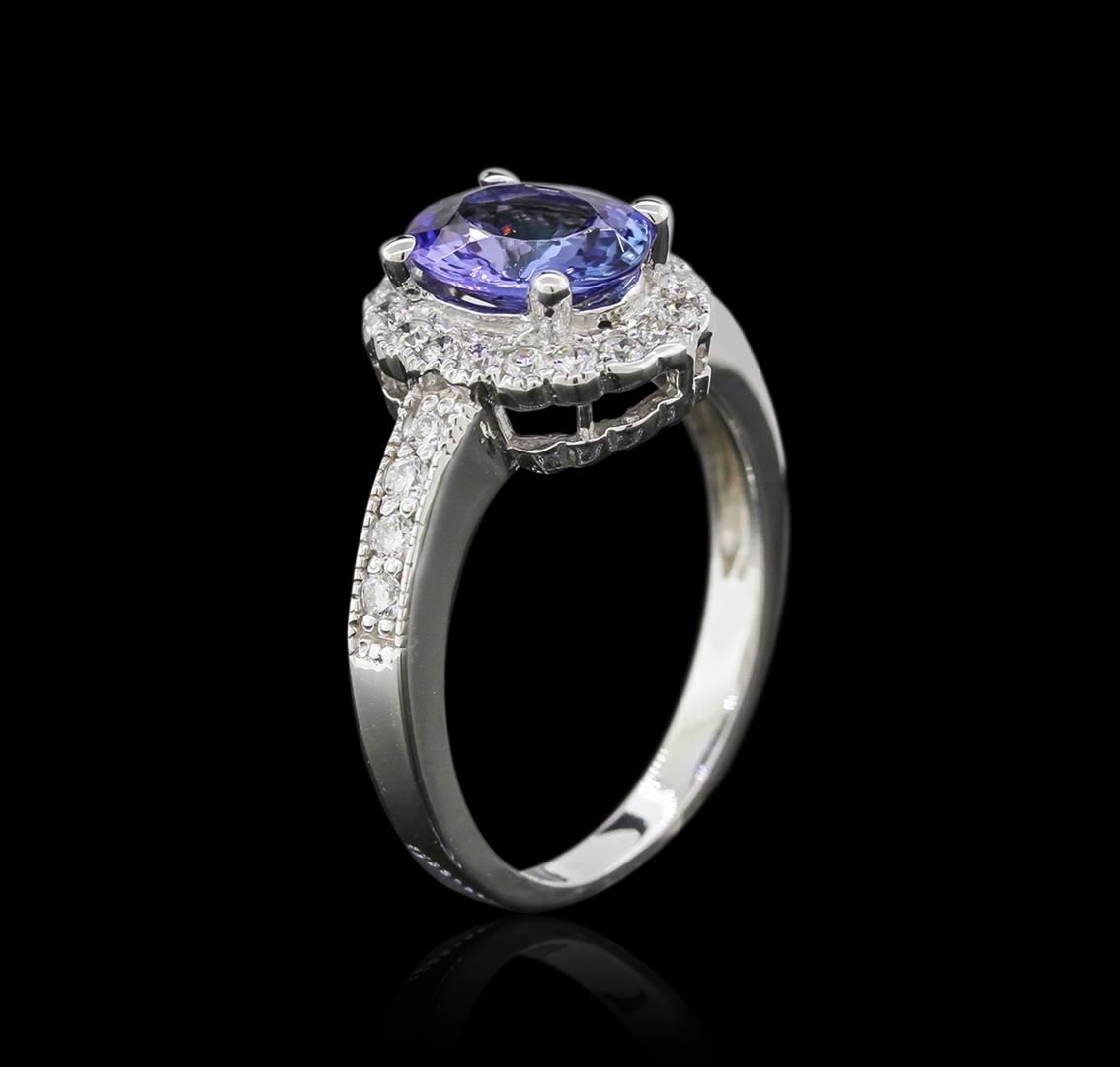 One electronically tested 14KT white gold ladies cast tanzanite and diamond ring with a bright polish finish. Condition is new. Containing: One prong set oval modified brilliant cut natural tanzanite, measuring 8.70 x 6.80 x 4.42mm, approximate weight of 1.53ct., clarity is eye clean, type I, medium light, very slightly grayish, violet color, (GIA V 4/3), cut is good. Fourteen prong set round brilliant cut diamonds, measuring 2.00 - 2.00 x 1.20mm (depth est.) approximate total weight of 14 Stones = 0.52ct. Clarity: SI-1 to SI-2. Color: I - J, Cut is Good. Colored gemstones are presumed to have been subjected to commonly used enhancement processes. All diamonds and colored gemstones are graded in the mounting, unless otherwise stated. Total Weight of Colored Stones 1.53ct. Total Weight of Diamonds 0.52ct. Total Weight of Ring 4.20 grams. GGL Appraised at $2,625.00.