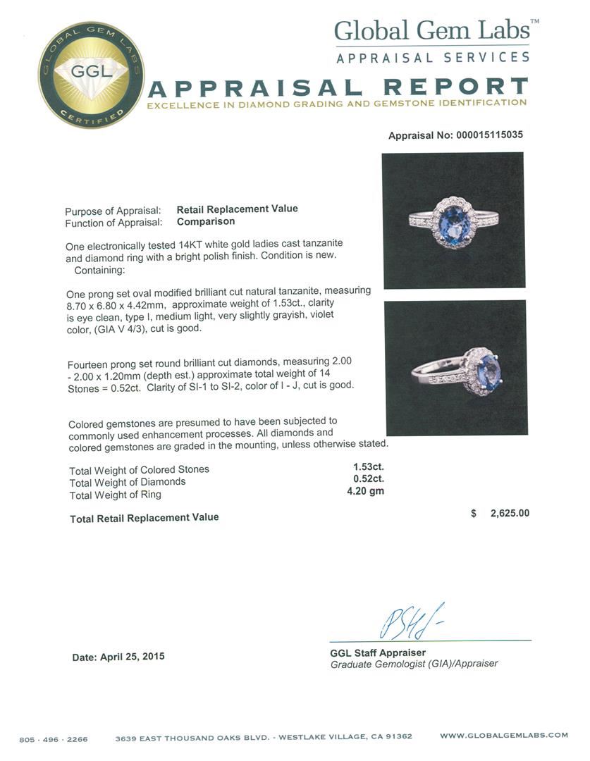 One electronically tested 14KT white gold ladies cast tanzanite and diamond ring with a bright polish finish. Condition is new. Containing: One prong set oval modified brilliant cut natural tanzanite, measuring 8.70 x 6.80 x 4.42mm, approximate weight of 1.53ct., clarity is eye clean, type I, medium light, very slightly grayish, violet color, (GIA V 4/3), cut is good. Fourteen prong set round brilliant cut diamonds, measuring 2.00 - 2.00 x 1.20mm (depth est.) approximate total weight of 14 Stones = 0.52ct. Clarity: SI-1 to SI-2. Color: I - J, Cut is Good. Colored gemstones are presumed to have been subjected to commonly used enhancement processes. All diamonds and colored gemstones are graded in the mounting, unless otherwise stated. Total Weight of Colored Stones 1.53ct. Total Weight of Diamonds 0.52ct. Total Weight of Ring 4.20 grams. GGL Appraised at $2,625.00.