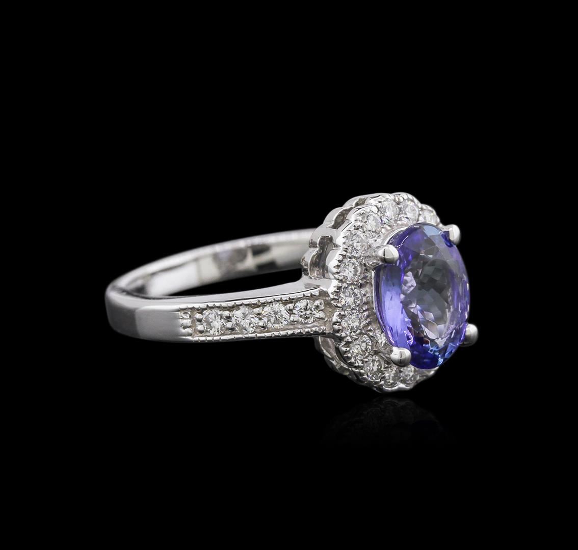 One electronically tested 14KT white gold ladies cast tanzanite and diamond ring with a bright polish finish. Condition is new. Containing: One prong set oval modified brilliant cut natural tanzanite, measuring 8.70 x 6.80 x 4.42mm, approximate weight of 1.53ct., clarity is eye clean, type I, medium light, very slightly grayish, violet color, (GIA V 4/3), cut is good. Fourteen prong set round brilliant cut diamonds, measuring 2.00 - 2.00 x 1.20mm (depth est.) approximate total weight of 14 Stones = 0.52ct. Clarity: SI-1 to SI-2. Color: I - J, Cut is Good. Colored gemstones are presumed to have been subjected to commonly used enhancement processes. All diamonds and colored gemstones are graded in the mounting, unless otherwise stated. Total Weight of Colored Stones 1.53ct. Total Weight of Diamonds 0.52ct. Total Weight of Ring 4.20 grams. GGL Appraised at $2,625.00.